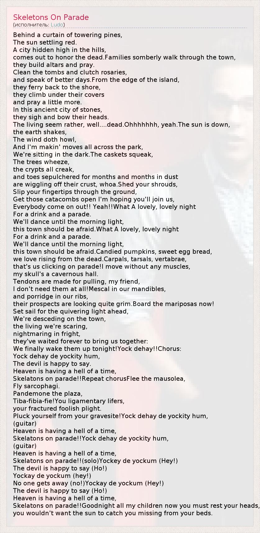 Behind a curtain of towering pines, The sun settling red. A city hidden high in the hills, comes out to honor the dead.Families somberly walk through the town, they build altars and pray. Clean the tombs and clutch rosaries, and speak of better days.From the edge of the island, they ferry back to the shore, they climb under their covers and pray a little more. In this ancient city of stones, they sigh and bow their heads. The living seem rather, well....dead.Ohhhhhhh, yeah.The sun is down, the earth shakes, The wind doth howl, And I'm makin' moves all across the park, We're sitting in the dark.The caskets squeak, The trees wheeze, the crypts all creak, and toes sepulchered for months and months in dust are wiggling off their crust, whoa.Shed your shrouds, Slip your fingertips through the ground, Get those catacombs open I'm hoping you'll join us, Everybody come on out!! Yeah!!What A lovely, lovely night For a drink and a parade. We'll dance until the morning light, this town should be afraid.What A lovely, lovely night For a drink and a parade. We'll dance until the morning light, this town should be afraid.Candied pumpkins, sweet egg bread, we love rising from the dead.Carpals, tarsals, vertabrae, that's us clicking on parade!I move without any muscles, my skull's a cavernous hall. Tendons are made for pulling, my friend, I don't need them at all!Mescal in our mandibles, and porridge in our ribs, their prospects are looking quite grim.Board the mariposas now! Set sail for the quivering light ahead, We're desceding on the town, the living we're scaring, nightmaring in fright, they've waited forever to bring us together: We finally wake them up tonight!Yock dehay!!Chorus: Yock dehay de yockity hum, The devil is happy to say. Heaven is having a hell of a time, Skelatons on parade!!Repeat chorusFlee the mausolea, Fly sarcophagi. Pandemone the plaza, Tiba-fibia-fie!You ligamentary lifers, your fractured foolish plight. Pluck yourself from your gravesite!Yock dehay de yockity hum, (guitar) Heaven is having a hell of a time, Skelatons on parade!!Yock dehay de yockity hum, (guitar) Heaven is having a hell of a time, Skelatons on parade!!(solo)Yockey de yockum (Hey!) The devil is happy to say (Ho!) Yockay de yockum (hey!) No one gets away (no!)Yockay de yockum (Hey!) The devil is happy to say (Ho!) Heaven is having a hell of a time, Skelatons on parade!!Goodnight all my children now you must rest your heads, you wouldn't want the sun to catch you missing from your beds.