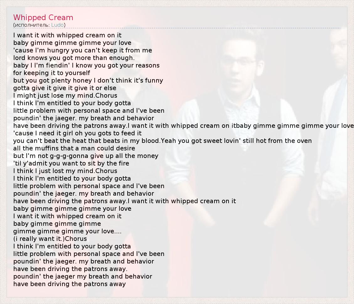I want it with whipped cream on it baby gimme gimme gimme your love 'cause I'm hungry you can't keep it from me lord knows you got more than enough. baby I I'm fiendin' I know you got your reasons for keeping it to yourself but you got plenty honey I don't think it's funny gotta give it give it give it or else I might just lose my mind.Chorus I think I'm entitled to your body gotta little problem with personal space and I've been poundin' the jaeger. my breath and behavior have been driving the patrons away.I want it with whipped cream on itbaby gimme gimme gimme your love 'cause I need it girl oh you gots to feed it you can't beat the heat that beats in my blood.Yeah you got sweet lovin' still hot from the oven all the muffins that a man could desire but I'm not g-g-g-gonna give up all the money 'til y'admit you want to sit by the fire I think I just lost my mind.Chorus I think I'm entitled to your body gotta little problem with personal space and I've been poundin' the jaeger. my breath and behavior have been driving the patrons away.I want it with whipped cream on it baby gimme gimme gimme your love I want it with whipped cream on it baby gimme gimme gimme gimme gimme gimme your love.... (i really want it.)Chorus I think I'm entitled to your body gotta little problem with personal space and I've been poundin' the jaeger. my breath and behavior have been driving the patrons away. poundin' the jaeger my breath and behavior have been driving the patrons away