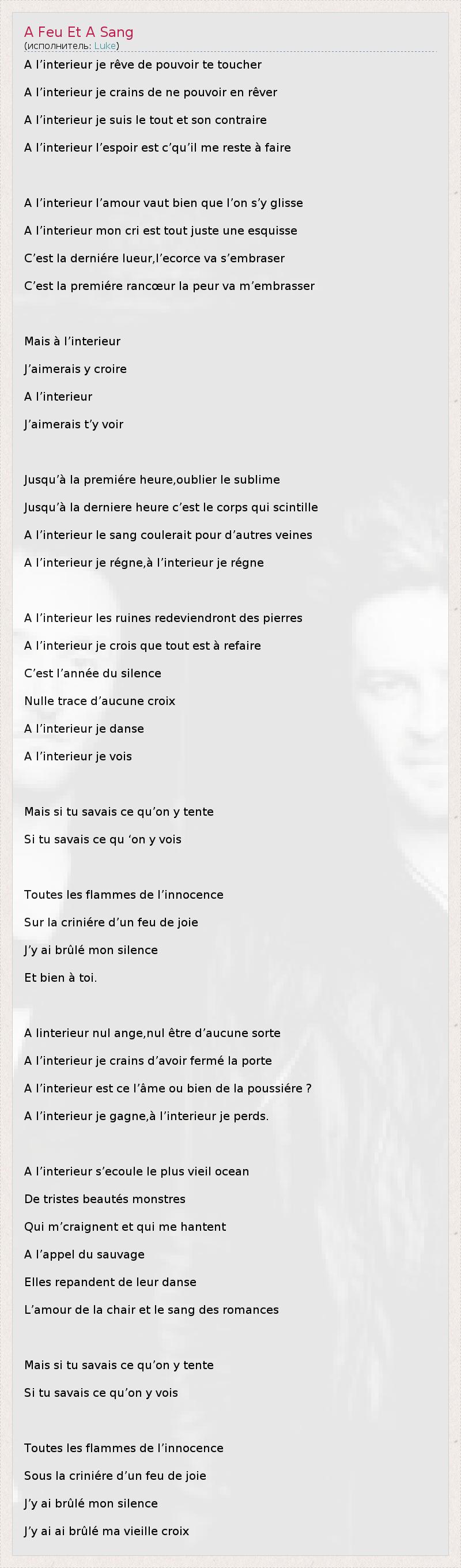 A l’interieur je rêve de pouvoir te toucher A l’interieur je crains de ne pouvoir en rêver A l’interieur je suis le tout et son contraire A l’interieur l’espoir est c’qu’il me reste à faire A l’interieur l’amour vaut bien que l’on s’y glisse A l’interieur mon cri est tout juste une esquisse C’est la derniére lueur,l’ecorce va s’embraser C’est la premiére rancœur la peur va m’embrasser Mais à l’interieur J’aimerais y croire A l’interieur J’aimerais t’y voir Jusqu’à la premiére heure,oublier le sublime Jusqu’à la derniere heure c’est le corps qui scintille A l’interieur le sang coulerait pour d’autres veines A l’interieur je régne,à l’interieur je régne A l’interieur les ruines redeviendront des pierres A l’interieur je crois que tout est à refaire C’est l’année du silence Nulle trace d’aucune croix A l’interieur je danse A l’interieur je vois Mais si tu savais ce qu’on y tente Si tu savais ce qu ‘on y vois Toutes les flammes de l’innocence Sur la criniére d’un feu de joie J’y ai brûlé mon silence Et bien à toi. A linterieur nul ange,nul être d’aucune sorte A l’interieur je crains d’avoir fermé la porte A l’interieur est ce l’âme ou bien de la poussiére ? A l’interieur je gagne,à l’interieur je perds. A l’interieur s’ecoule le plus vieil ocean De tristes beautés monstres Qui m’craignent et qui me hantent A l’appel du sauvage Elles repandent de leur danse L’amour de la chair et le sang des romances Mais si tu savais ce qu’on y tente Si tu savais ce qu’on y vois Toutes les flammes de l’innocence Sous la criniére d’un feu de joie J’y ai brûlé mon silence J’y ai ai brûlé ma vieille croix