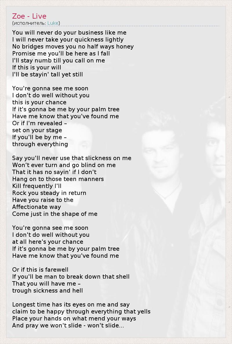 You will never do your business like me I will never take your quickness lightly No bridges moves you no half ways honey Promise me you'll be here as I fall I'll stay numb till you call on me If this is your will I'll be stayin' tall yet still You're gonna see me soon I don't do well without you this is your chance If it's gonna be me by your palm tree Have me know that you've found me Or if I'm revealed – set on your stage If you'll be by me – through everything Say you'll never use that slickness on me Won't ever turn and go blind on me That it has no sayin' if I don't Hang on to those teen manners Kill frequently I'll Rock you steady in return Have you raise to the Affectionate way Come just in the shape of me You're gonna see me soon I don't do well without you at all here's your chance If it's gonna be me by your palm tree Have me know that you've found me Or if this is farewell If you'll be man to break down that shell That you will have me – trough sickness and hell Longest time has its eyes on me and say claim to be happy through everything that yells Place your hands on what mend your ways And pray we won't slide - won't slide...