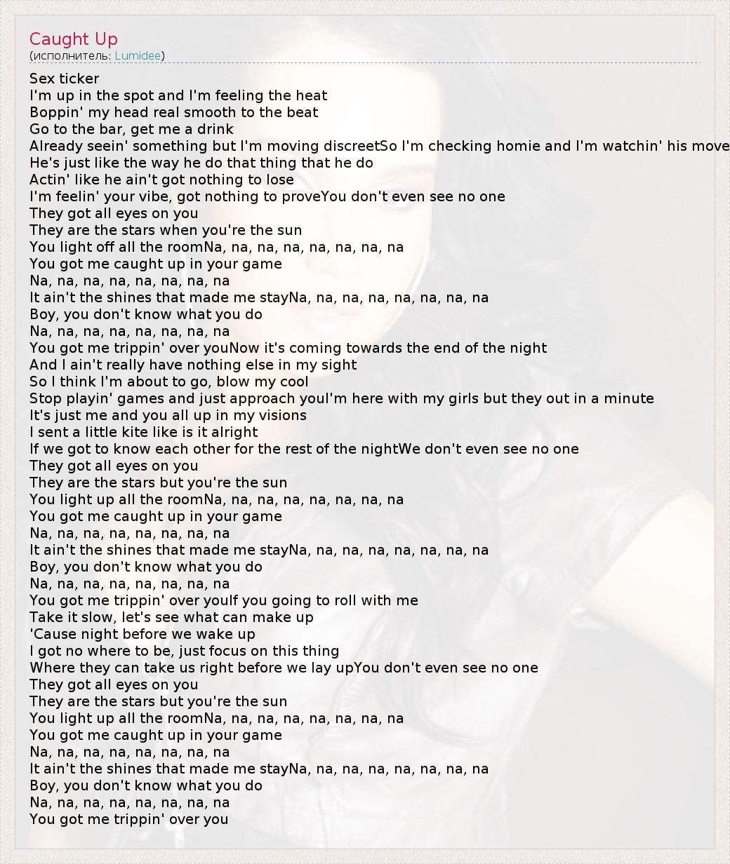 Sex ticker I'm up in the spot and I'm feeling the heat Boppin' my head real smooth to the beat Go to the bar, get me a drink Already seein' something but I'm moving discreetSo I'm checking homie and I'm watchin' his move He's just like the way he do that thing that he do Actin' like he ain't got nothing to lose I'm feelin' your vibe, got nothing to proveYou don't even see no one They got all eyes on you They are the stars when you're the sun You light off all the roomNa, na, na, na, na, na, na, na You got me caught up in your game Na, na, na, na, na, na, na, na It ain't the shines that made me stayNa, na, na, na, na, na, na, na Boy, you don't know what you do Na, na, na, na, na, na, na, na You got me trippin' over youNow it's coming towards the end of the night And I ain't really have nothing else in my sight So I think I'm about to go, blow my cool Stop playin' games and just approach youI'm here with my girls but they out in a minute It's just me and you all up in my visions I sent a little kite like is it alright If we got to know each other for the rest of the nightWe don't even see no one They got all eyes on you They are the stars but you're the sun You light up all the roomNa, na, na, na, na, na, na, na You got me caught up in your game Na, na, na, na, na, na, na, na It ain't the shines that made me stayNa, na, na, na, na, na, na, na Boy, you don't know what you do Na, na, na, na, na, na, na, na You got me trippin' over youIf you going to roll with me Take it slow, let's see what can make up 'Cause night before we wake up I got no where to be, just focus on this thing Where they can take us right before we lay upYou don't even see no one They got all eyes on you They are the stars but you're the sun You light up all the roomNa, na, na, na, na, na, na, na You got me caught up in your game Na, na, na, na, na, na, na, na It ain't the shines that made me stayNa, na, na, na, na, na, na, na Boy, you don't know what you do Na, na, na, na, na, na, na, na You got me trippin' over you