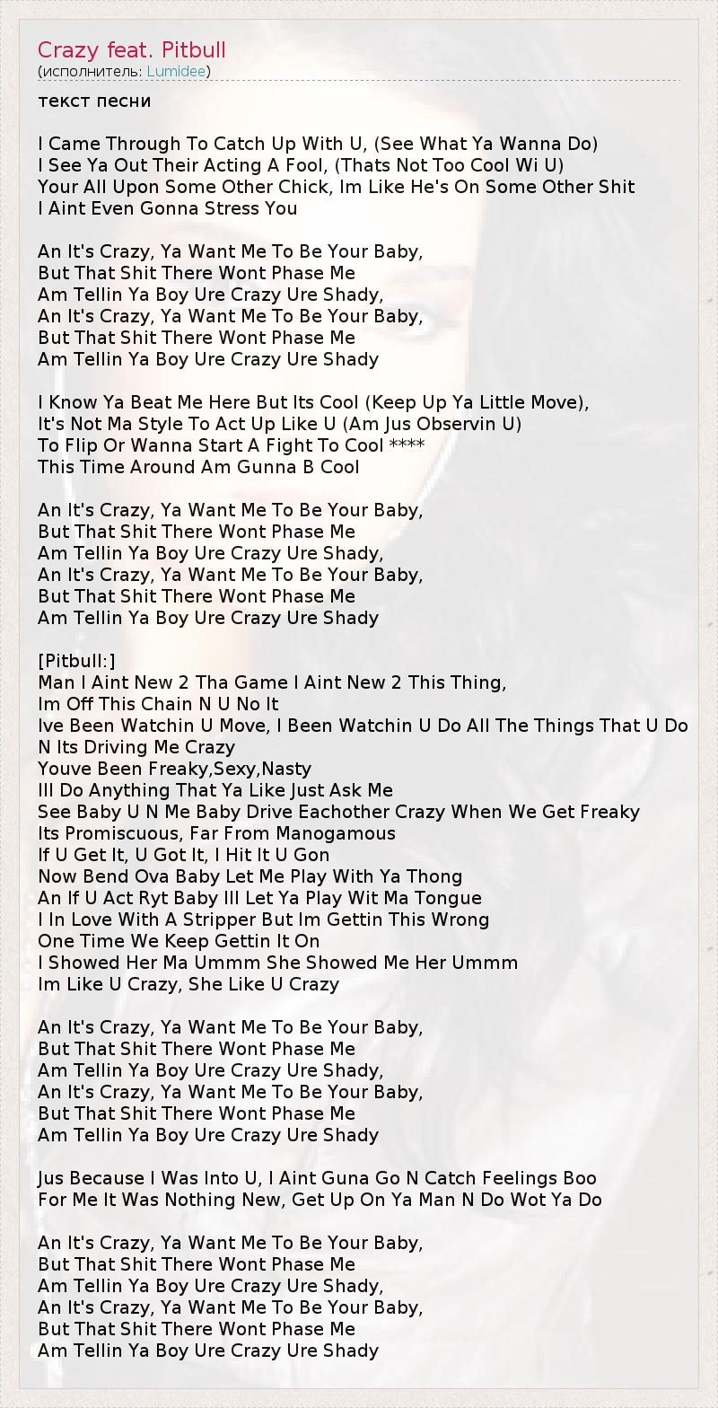 текст песни I Came Through To Catch Up With U, (See What Ya Wanna Do) I See Ya Out Their Acting A Fool, (Thats Not Too Cool Wi U) Your All Upon Some Other Chick, Im Like He's On Some Other Shit I Aint Even Gonna Stress You An It's Crazy, Ya Want Me To Be Your Baby, But That Shit There Wont Phase Me Am Tellin Ya Boy Ure Crazy Ure Shady, An It's Crazy, Ya Want Me To Be Your Baby, But That Shit There Wont Phase Me Am Tellin Ya Boy Ure Crazy Ure Shady I Know Ya Beat Me Here But Its Cool (Keep Up Ya Little Move), It's Not Ma Style To Act Up Like U (Am Jus Observin U) To Flip Or Wanna Start A Fight To Cool **** This Time Around Am Gunna B Cool An It's Crazy, Ya Want Me To Be Your Baby, But That Shit There Wont Phase Me Am Tellin Ya Boy Ure Crazy Ure Shady, An It's Crazy, Ya Want Me To Be Your Baby, But That Shit There Wont Phase Me Am Tellin Ya Boy Ure Crazy Ure Shady [Pitbull:] Man I Aint New 2 Tha Game I Aint New 2 This Thing, Im Off This Chain N U No It Ive Been Watchin U Move, I Been Watchin U Do All The Things That U Do N Its Driving Me Crazy Youve Been Freaky,Sexy,Nasty Ill Do Anything That Ya Like Just Ask Me See Baby U N Me Baby Drive Eachother Crazy When We Get Freaky Its Promiscuous, Far From Manogamous If U Get It, U Got It, I Hit It U Gon Now Bend Ova Baby Let Me Play With Ya Thong An If U Act Ryt Baby Ill Let Ya Play Wit Ma Tongue I In Love With A Stripper But Im Gettin This Wrong One Time We Keep Gettin It On I Showed Her Ma Ummm She Showed Me Her Ummm Im Like U Crazy, She Like U Crazy An It's Crazy, Ya Want Me To Be Your Baby, But That Shit There Wont Phase Me Am Tellin Ya Boy Ure Crazy Ure Shady, An It's Crazy, Ya Want Me To Be Your Baby, But That Shit There Wont Phase Me Am Tellin Ya Boy Ure Crazy Ure Shady Jus Because I Was Into U, I Aint Guna Go N Catch Feelings Boo For Me It Was Nothing New, Get Up On Ya Man N Do Wot Ya Do An It's Crazy, Ya Want Me To Be Your Baby, But That Shit There Wont Phase Me Am Tellin Ya Boy Ure Crazy Ure Shady, An It's Crazy, Ya Want Me To Be Your Baby, But That Shit There Wont Phase Me Am Tellin Ya Boy Ure Crazy Ure Shady