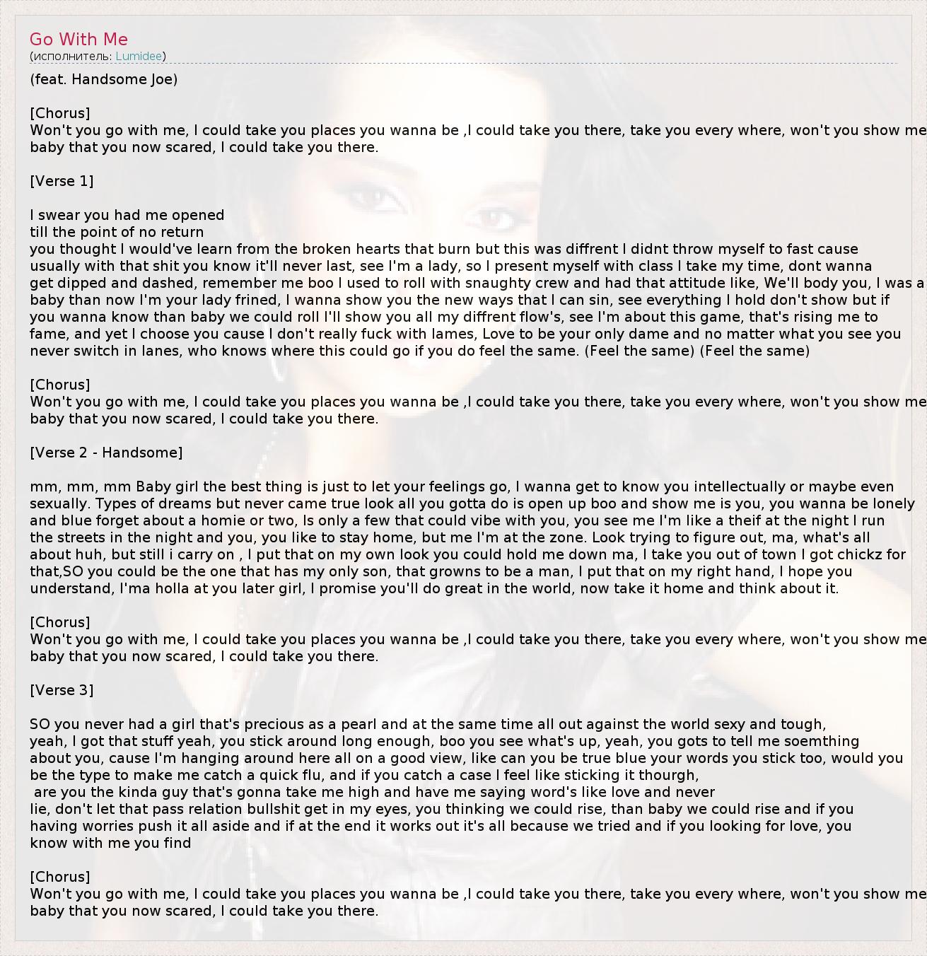 Won't you go with me, I could take you places you wanna be ,I could take you there, take you every where, won't you show me