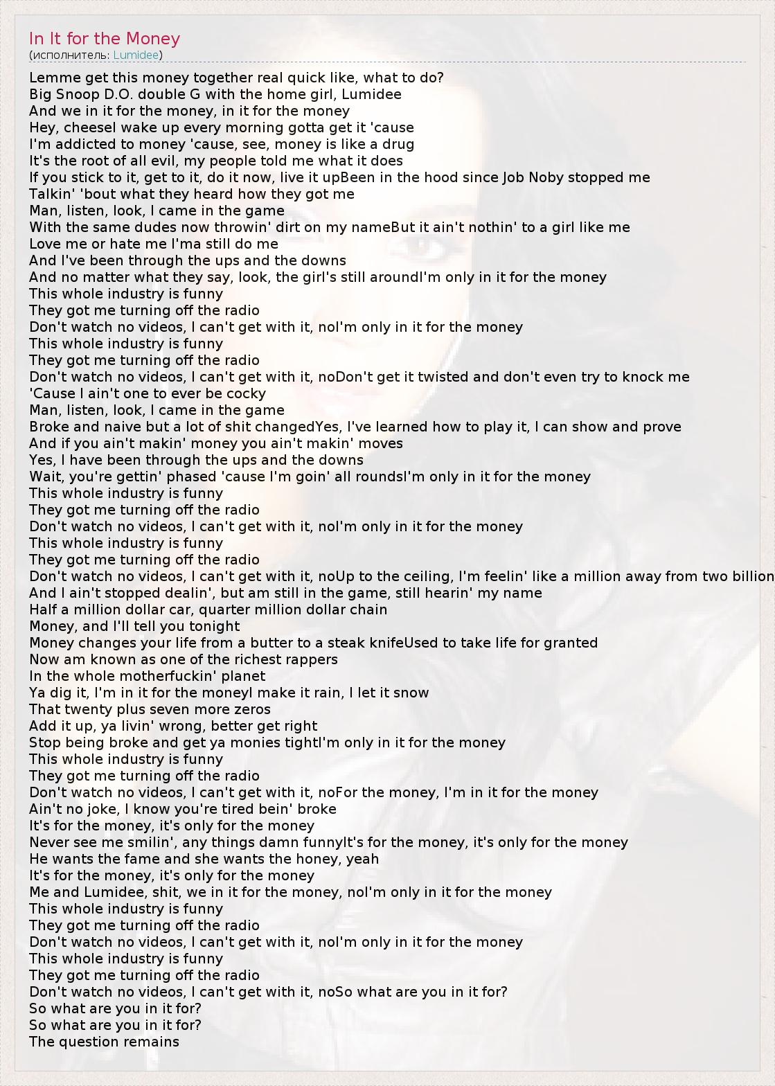 А как ты думаешь, о чем песня "In It for the Money" ?