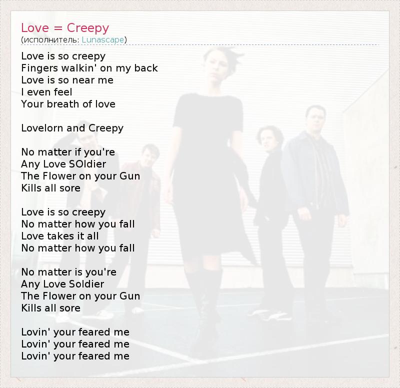 Love is so creepy Fingers walkin' on my back Love is so near me I even feel Your breath of love Lovelorn and Creepy No matter if you're Any Love SOldier The Flower on your Gun Kills all sore Love is so creepy No matter how you fall Love takes it all No matter how you fall No matter is you're Any Love Soldier The Flower on your Gun Kills all sore Lovin' your feared me Lovin' your feared me Lovin' your feared me