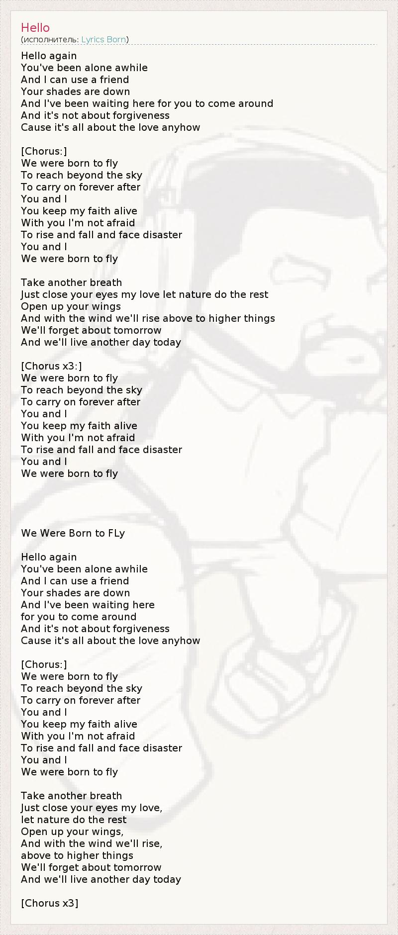 Hello again You've been alone awhile And I can use a friend Your shades are down And I've been waiting here for you to come around And it's not about forgiveness Cause it's all about the love anyhow [Chorus:] We were born to fly To reach beyond the sky To carry on forever after You and I You keep my faith alive With you I'm not afraid To rise and fall and face disaster You and I We were born to fly Take another breath Just close your eyes my love let nature do the rest Open up your wings And with the wind we'll rise above to higher things We'll forget about tomorrow And we'll live another day today [Chorus x3:] We were born to fly To reach beyond the sky To carry on forever after You and I You keep my faith alive With you I'm not afraid To rise and fall and face disaster You and I We were born to fly We Were Born to FLy Hello again You've been alone awhile And I can use a friend Your shades are down And I've been waiting here for you to come around And it's not about forgiveness Cause it's all about the love anyhow [Chorus:] We were born to fly To reach beyond the sky To carry on forever after You and I You keep my faith alive With you I'm not afraid To rise and fall and face disaster You and I We were born to fly Take another breath Just close your eyes my love, let nature do the rest Open up your wings, And with the wind we'll rise, above to higher things We'll forget about tomorrow And we'll live another day today [Chorus x3]