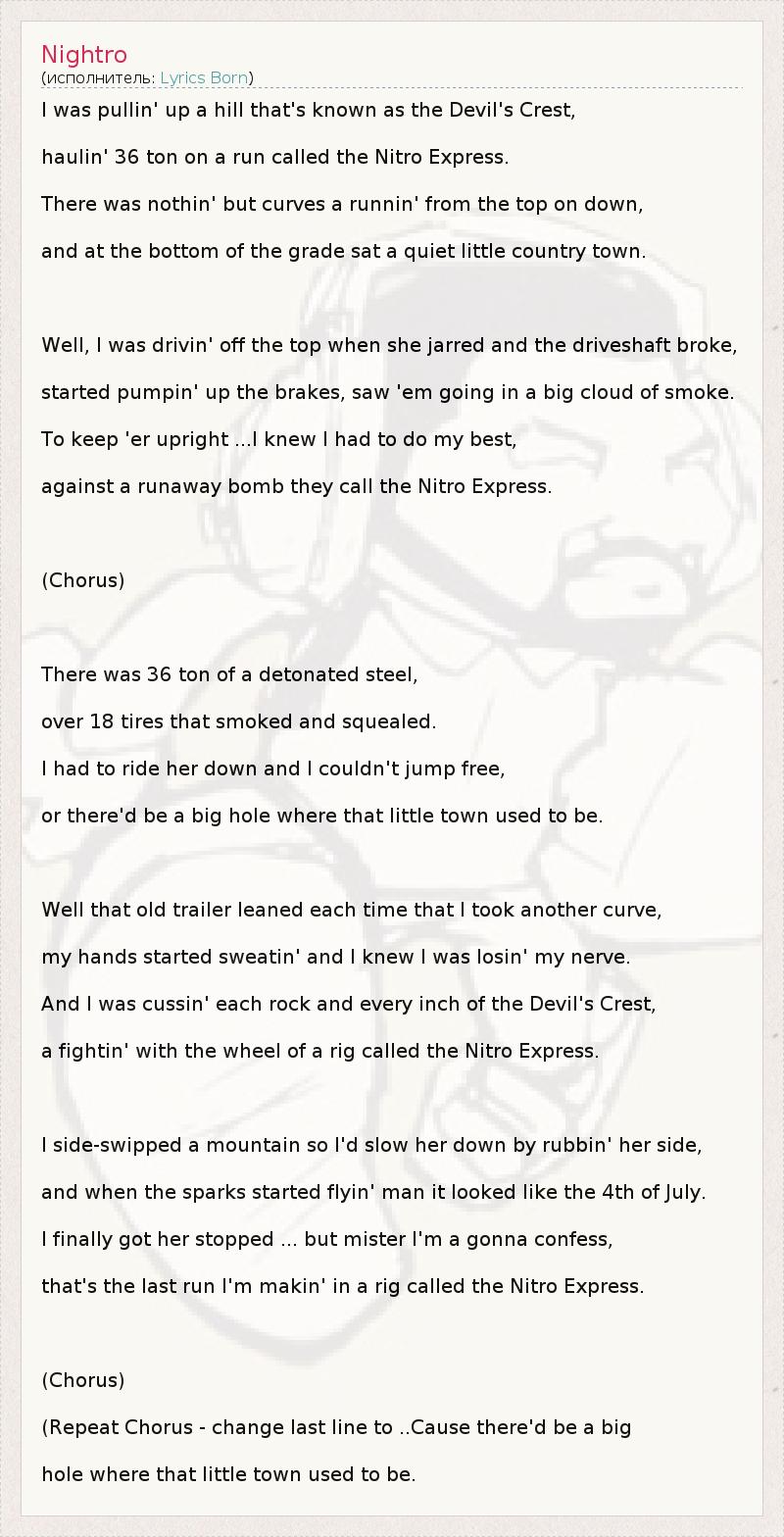 I was pullin' up a hill that's known as the Devil's Crest, haulin' 36 ton on a run called the Nitro Express. There was nothin' but curves a runnin' from the top on down, and at the bottom of the grade sat a quiet little country town. Well, I was drivin' off the top when she jarred and the driveshaft broke, started pumpin' up the brakes, saw 'em going in a big cloud of smoke. To keep 'er upright ...I knew I had to do my best, against a runaway bomb they call the Nitro Express. (Chorus) There was 36 ton of a detonated steel, over 18 tires that smoked and squealed. I had to ride her down and I couldn't jump free, or there'd be a big hole where that little town used to be. Well that old trailer leaned each time that I took another curve, my hands started sweatin' and I knew I was losin' my nerve. And I was cussin' each rock and every inch of the Devil's Crest, a fightin' with the wheel of a rig called the Nitro Express. I side-swipped a mountain so I'd slow her down by rubbin' her side, and when the sparks started flyin' man it looked like the 4th of July. I finally got her stopped ... but mister I'm a gonna confess, that's the last run I'm makin' in a rig called the Nitro Express. (Chorus) (Repeat Chorus - change last line to ..Cause there'd be a big hole where that little town used to be.
