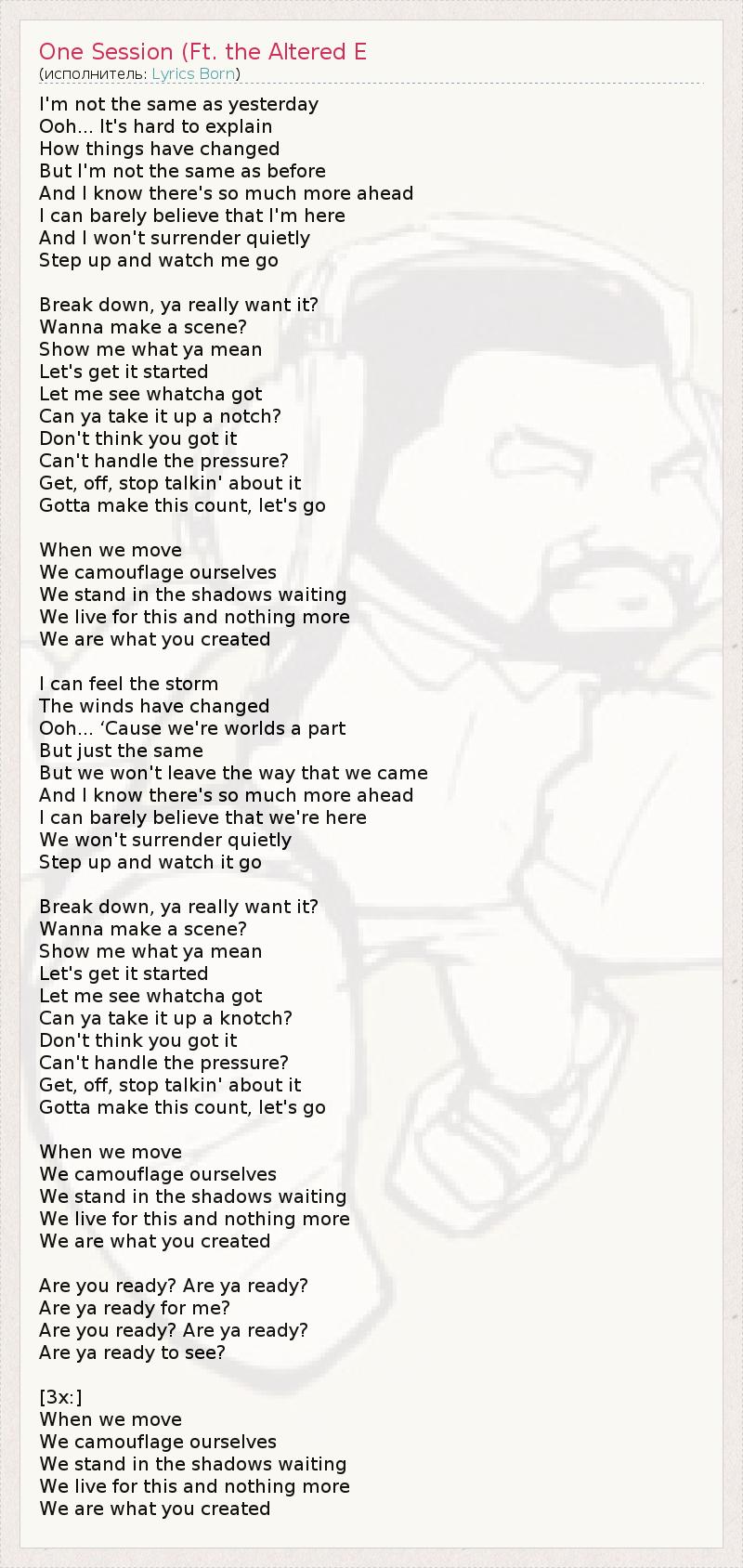 Я не такой, как был вчера... Ох... Трудно объяснить, Как все изменилось... Но я не такой, каким был раньше. И я знаю, что гораздо больше меня ждет впереди... Я едва могу поверить в то, что я здесь... И я не сдамся без боя. Шаг вперед – смотри мне вслед. Сломаться – ты и правда хочешь этого? Хочешь устроить сцену? Объясни, что ты имеешь в виду. Давай начнем. Позволь увидеть, что у тебя есть. Ты можешь подняться хоть немного выше? Не думаю, что ты меня понял. Не справляешься с давлением? Отвали, прекрати говорить об этом. Пора открывать счет, начнем! Когда мы движемся, Мы маскируемся, Мы стоим в тени, ожидая, Мы живем для этого и ни для чего больше. Мы – то, что ты создал. Я могу чувствовать бурю, Изменение ветра... Ох... Поэтому мы – часть мира. Но мы такие же. Но мы не сойдем с пути, по которому шли. И я знаю, что гораздо больше меня ждет впереди... Я едва могу поверить в то, что мы здесь... Мы не сдадимся без боя. Шаг вперед – смотри нам вслед. Сломаться – ты и правда хочешь этого? Хочешь устроить сцену? Объясни, что ты имеешь в виду. Давай начнем. Позволь увидеть, что у тебя есть. Ты можешь подняться хоть немного выше? Не думаю, что ты меня понял. Не справляешься с давлением? Отвали, прекрати говорить об этом. Пора открывать счет, начнем! Когда мы движемся, Мы маскируемся, Мы стоим в тени, ожидая, Мы живем для этого и ни для чего больше. Мы – то, что ты создал. Ты готов? Ты готов? Ты готов ко мне? Ты готов? Ты готов? Ты готов ко мне? [3x:] Когда мы движемся, Мы маскируемся, Мы стоим в тени, ожидая, Мы живем для этого и ни для чего больше. Мы – то, что ты создал.