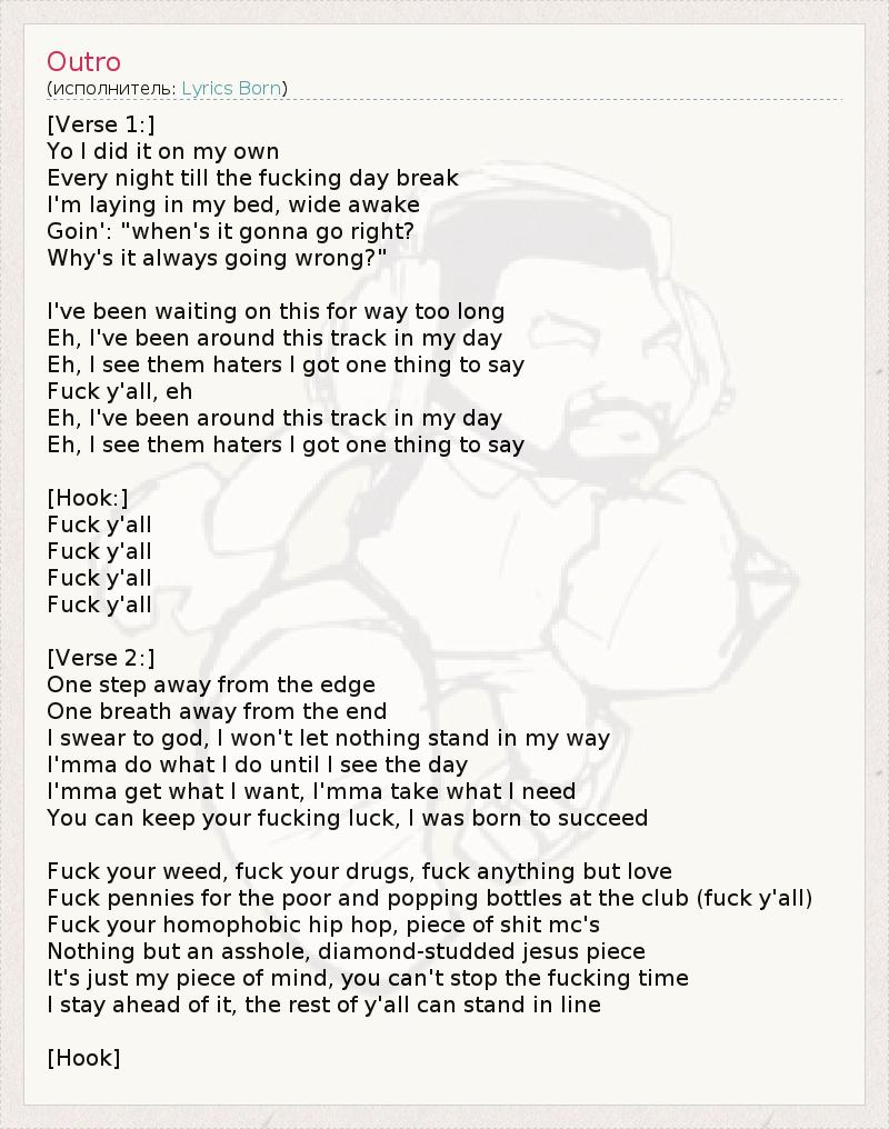 [Verse 1:] Yo I did it on my own Every night till the fucking day break I'm laying in my bed, wide awake Goin': "when's it gonna go right? Why's it always going wrong?" I've been waiting on this for way too long Eh, I've been around this track in my day Eh, I see them haters I got one thing to say Fuck y'all, eh Eh, I've been around this track in my day Eh, I see them haters I got one thing to say [Hook:] Fuck y'all Fuck y'all Fuck y'all Fuck y'all [Verse 2:] One step away from the edge One breath away from the end I swear to god, I won't let nothing stand in my way I'mma do what I do until I see the day I'mma get what I want, I'mma take what I need You can keep your fucking luck, I was born to succeed Fuck your weed, fuck your drugs, fuck anything but love Fuck pennies for the poor and popping bottles at the club (fuck y'all) Fuck your homophobic hip hop, piece of shit mc's Nothing but an asshole, diamond-studded jesus piece It's just my piece of mind, you can't stop the fucking time I stay ahead of it, the rest of y'all can stand in line [Hook]