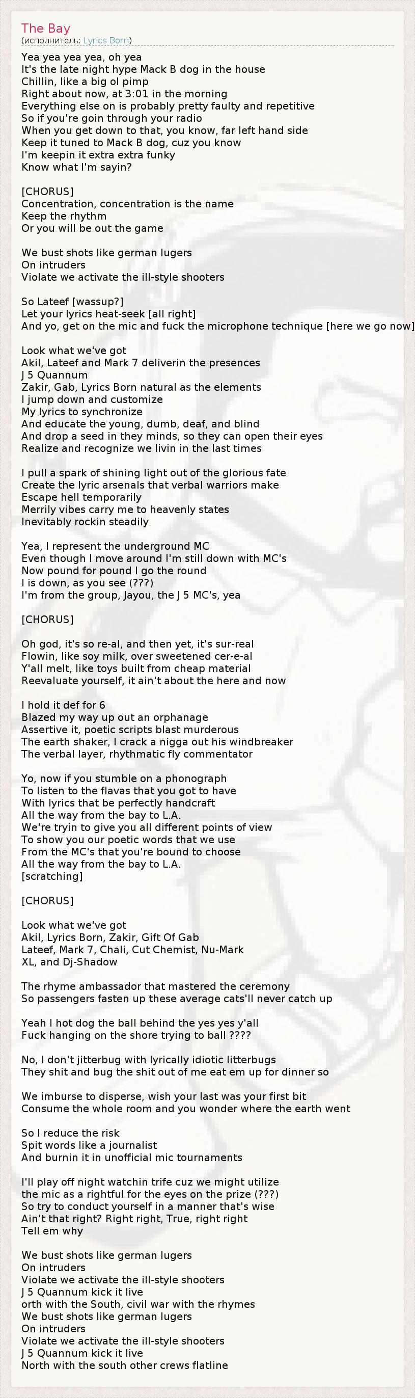 Yea yea yea yea, oh yea It's the late night hype Mack B dog in the house Chillin, like a big ol pimp Right about now, at 3:01 in the morning Everything else on is probably pretty faulty and repetitive So if you're goin through your radio When you get down to that, you know, far left hand side Keep it tuned to Mack B dog, cuz you know I'm keepin it extra extra funky Know what I'm sayin? [CHORUS] Concentration, concentration is the name Keep the rhythm Or you will be out the game We bust shots like german lugers On intruders Violate we activate the ill-style shooters So Lateef [wassup?] Let your lyrics heat-seek [all right] And yo, get on the mic and fuck the microphone technique [here we go now] Look what we've got Akil, Lateef and Mark 7 deliverin the presences J 5 Quannum Zakir, Gab, Lyrics Born natural as the elements I jump down and customize My lyrics to synchronize And educate the young, dumb, deaf, and blind And drop a seed in they minds, so they can open their eyes Realize and recognize we livin in the last times I pull a spark of shining light out of the glorious fate Create the lyric arsenals that verbal warriors make Escape hell temporarily Merrily vibes carry me to heavenly states Inevitably rockin steadily Yea, I represent the underground MC Even though I move around I'm still down with MC's Now pound for pound I go the round I is down, as you see (???) I'm from the group, Jayou, the J 5 MC's, yea [CHORUS] Oh god, it's so re-al, and then yet, it's sur-real Flowin, like soy milk, over sweetened cer-e-al Y'all melt, like toys built from cheap material Reevaluate yourself, it ain't about the here and now I hold it def for 6 Blazed my way up out an orphanage Assertive it, poetic scripts blast murderous The earth shaker, I crack a nigga out his windbreaker The verbal layer, rhythmatic fly commentator Yo, now if you stumble on a phonograph To listen to the flavas that you got to have With lyrics that be perfectly handcraft All the way from the bay to L.A. We're tryin to give you all different points of view To show you our poetic words that we use From the MC's that you're bound to choose All the way from the bay to L.A. [scratching] [CHORUS] Look what we've got Akil, Lyrics Born, Zakir, Gift Of Gab Lateef, Mark 7, Chali, Cut Chemist, Nu-Mark XL, and Dj-Shadow The rhyme ambassador that mastered the ceremony So passengers fasten up these average cats'll never catch up Yeah I hot dog the ball behind the yes yes y'all Fuck hanging on the shore trying to ball ???? No, I don't jitterbug with lyrically idiotic litterbugs They shit and bug the shit out of me eat em up for dinner so We imburse to disperse, wish your last was your first bit Consume the whole room and you wonder where the earth went So I reduce the risk Spit words like a journalist And burnin it in unofficial mic tournaments I'll play off night watchin trife cuz we might utilize the mic as a rightful for the eyes on the prize (???) So try to conduct yourself in a manner that's wise Ain't that right? Right right, True, right right Tell em why We bust shots like german lugers On intruders Violate we activate the ill-style shooters J 5 Quannum kick it live orth with the South, civil war with the rhymes We bust shots like german lugers On intruders Violate we activate the ill-style shooters J 5 Quannum kick it live North with the south other crews flatline