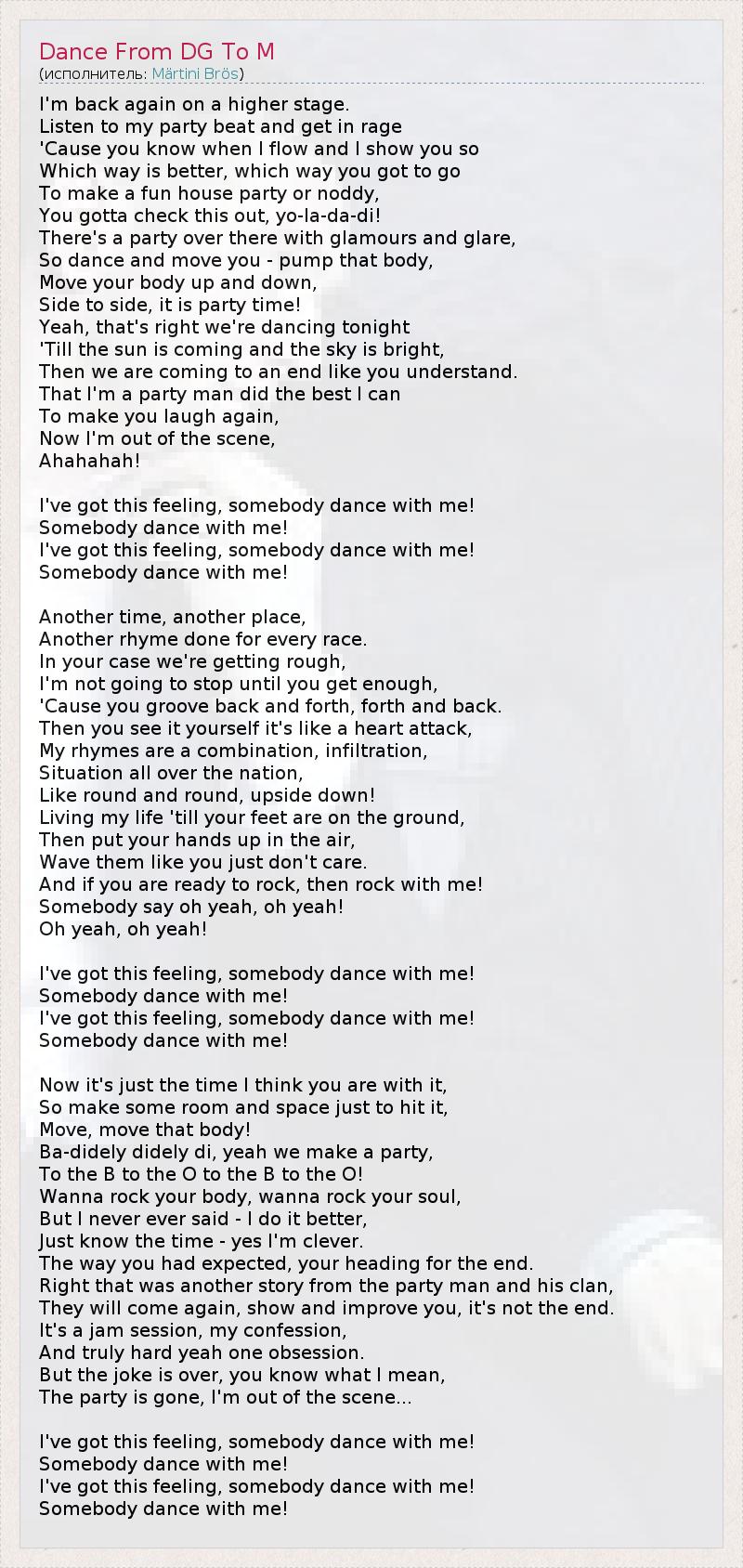 I'm back again on a higher stage. Listen to my party beat and get in rage 'Cause you know when I flow and I show you so Which way is better, which way you got to go To make a fun house party or noddy, You gotta check this out, yo-la-da-di! There's a party over there with glamours and glare, So dance and move you - pump that body, Move your body up and down, Side to side, it is party time! Yeah, that's right we're dancing tonight 'Till the sun is coming and the sky is bright, Then we are coming to an end like you understand. That I'm a party man did the best I can To make you laugh again, Now I'm out of the scene, Ahahahah! I've got this feeling, somebody dance with me! Somebody dance with me! I've got this feeling, somebody dance with me! Somebody dance with me! Another time, another place, Another rhyme done for every race. In your case we're getting rough, I'm not going to stop until you get enough, 'Cause you groove back and forth, forth and back. Then you see it yourself it's like a heart attack, My rhymes are a combination, infiltration, Situation all over the nation, Like round and round, upside down! Living my life 'till your feet are on the ground, Then put your hands up in the air, Wave them like you just don't care. And if you are ready to rock, then rock with me! Somebody say oh yeah, oh yeah! Oh yeah, oh yeah! I've got this feeling, somebody dance with me! Somebody dance with me! I've got this feeling, somebody dance with me! Somebody dance with me! Now it's just the time I think you are with it, So make some room and space just to hit it, Move, move that body! Ba-didely didely di, yeah we make a party, To the B to the O to the B to the O! Wanna rock your body, wanna rock your soul, But I never ever said - I do it better, Just know the time - yes I'm clever. The way you had expected, your heading for the end. Right that was another story from the party man and his clan, They will come again, show and improve you, it's not the end. It's a jam session, my confession, And truly hard yeah one obsession. But the joke is over, you know what I mean, The party is gone, I'm out of the scene... I've got this feeling, somebody dance with me! Somebody dance with me! I've got this feeling, somebody dance with me! Somebody dance with me!