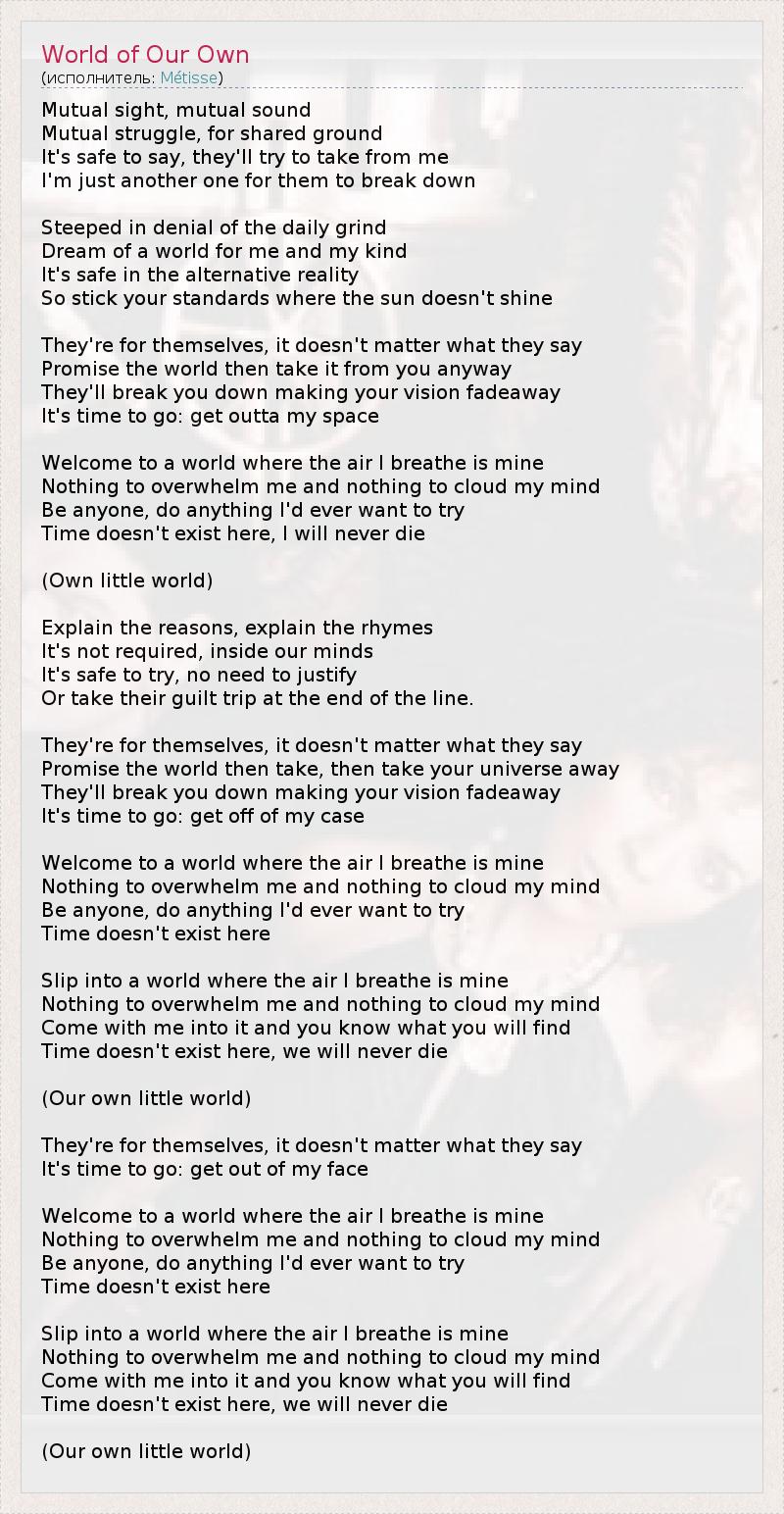 Общая точка зрения, общая песня, Общая борьба за разделенную землю. Можно с уверенностью сказать, что они попытаются забрать у меня. Я для них всего лишь еще одно существо, которое можно уничтожить. С головой ушедший в отказ от ежедневной тягомотины, В мечтах о мире для меня и подобных мне. Это легко в другой реальности, Так что засунь свои стандарты в одно место. Они живут для себя, что бы они ни говорили, Обещая тебе мир, который они забирают у тебя потом так или иначе, Они сломят тебя, уничтожат твою точку зрения. Пришло время уходить: проваливай с моей территории! Добро пожаловать в мир, где воздух, которым я дышу, принадлежит мне, Где нет ничего, что подавляет меня и затуманивает мой разум. Будь личностью, делай то, что ты хочешь. Здесь нет времени, я никогда не умру! (Наш собственный маленький мир) Разъясни причины, дай объяснение рифмам, Это не требуется нашим разумом. Это легко попробовать, не нужно оправдываться Или в конце концов брать их вину на себя. Они живут для себя, и что бы они ни говорили, Они сначала обещают тебе мир, а потом забирают твою вселенную. Они сломят тебя, уничтожат твою точку зрения. Пришло время уходить: перестань меня раздражать! Добро пожаловать в мир, где воздух, которым я дышу, принадлежит мне, Где нет ничего, что подавляет меня и затуманивает мой разум. Будь личностью, делай то, что ты хочешь. Здесь нет времени. Проскользни в мир, где воздух, которым я дышу, принадлежит мне, Где нет ничего, что подавляет меня и затуманивает мой разум. Пойдём туда вместе со мной и узнай, что ты там найдешь. Здесь нет времени, мы никогда не умрем! (Наш собственный маленький мир) Они живут для себя, не важно, что они говорят. Время пришло, уйди с моих глаз. Добро пожаловать в мир, где воздух, которым я дышу, принадлежит мне, Где нет ничего, что подавляет меня и затуманивает мой разум. Будь личностью, делай то, что ты хочешь. Здесь нет времени. Проскользни в мир, где воздух, которым я дышу, принадлежит мне, Где нет ничего, что подавляет меня и затуманивает мой разум. Иди туда вместе со мной и узнай, что ты там найдешь. Здесь нет времени, мы никогда не умрем! (Наш собственный маленький мир)