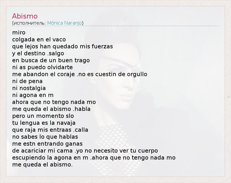 miro colgada en el vaco que lejos han quedado mis fuerzas y el destino .salgo en busca de un buen trago ni as puedo olvidarte me abandon el coraje .no es cuestin de orgullo ni de pena ni nostalgia ni agona en m ahora que no tengo nada mo me queda el abismo .habla pero un momento slo tu lengua es la navaja que raja mis entraas .calla no sabes lo que hablas me estn entrando ganas de acariciar mi cama .yo no necesito ver tu cuerpo escupiendo la agona en m .ahora que no tengo nada mo me queda el abismo.