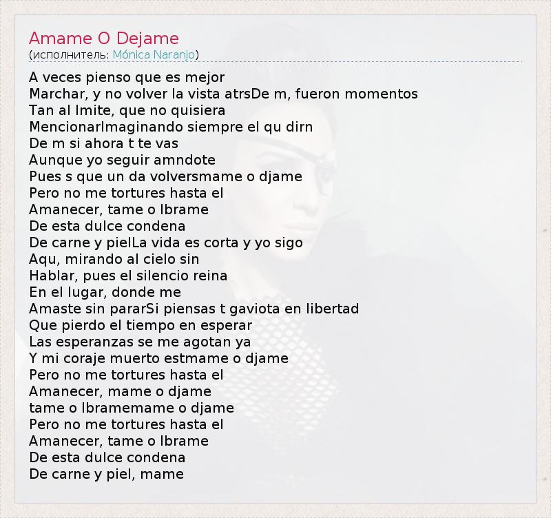 A veces pienso que es mejor Marchar, y no volver la vista atrsDe m, fueron momentos Tan al lmite, que no quisiera MencionarImaginando siempre el qu dirn De m si ahora t te vas Aunque yo seguir amndote Pues s que un da volversmame o djame Pero no me tortures hasta el Amanecer, tame o lbrame De esta dulce condena De carne y pielLa vida es corta y yo sigo Aqu, mirando al cielo sin Hablar, pues el silencio reina En el lugar, donde me Amaste sin pararSi piensas t gaviota en libertad Que pierdo el tiempo en esperar Las esperanzas se me agotan ya Y mi coraje muerto estmame o djame Pero no me tortures hasta el Amanecer, mame o djame tame o lbramemame o djame Pero no me tortures hasta el Amanecer, tame o lbrame De esta dulce condena De carne y piel, mame