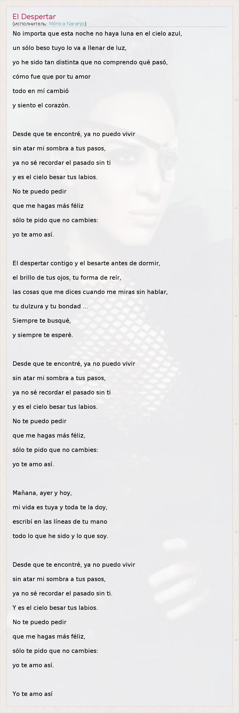 No importa que esta noche no haya luna en el cielo azul, un sólo beso tuyo lo va a llenar de luz, yo he sido tan distinta que no comprendo qué pasó, cómo fue que por tu amor todo en mí cambió y siento el corazón. Desde que te encontré, ya no puedo vivir sin atar mi sombra a tus pasos, ya no sé recordar el pasado sin ti y es el cielo besar tus labios. No te puedo pedir que me hagas más féliz sólo te pido que no cambies: yo te amo así. El despertar contigo y el besarte antes de dormir, el brillo de tus ojos, tu forma de reír, las cosas que me dices cuando me miras sin hablar, tu dulzura y tu bondad ... Siempre te busqué, y siempre te esperé. Desde que te encontré, ya no puedo vivir sin atar mi sombra a tus pasos, ya no sé recordar el pasado sin ti y es el cielo besar tus labios. No te puedo pedir que me hagas más féliz, sólo te pido que no cambies: yo te amo así. Mañana, ayer y hoy, mi vida es tuya y toda te la doy, escribí en las líneas de tu mano todo lo que he sido y lo que soy. Desde que te encontré, ya no puedo vivir sin atar mi sombra a tus pasos, ya no sé recordar el pasado sin ti. Y es el cielo besar tus labios. No te puedo pedir que me hagas más féliz, sólo te pido que no cambies: yo te amo así. Yo te amo así
