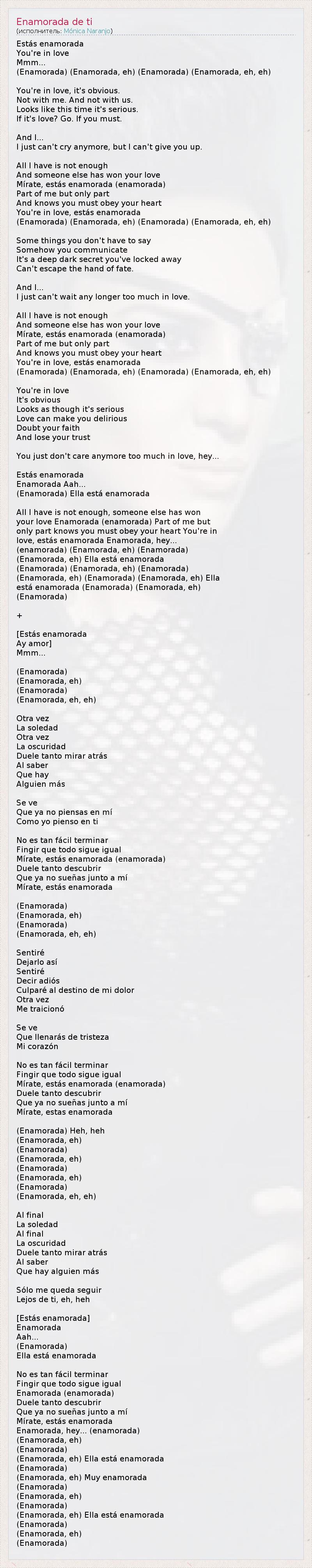 Estás enamorada You're in love Mmm... (Enamorada) (Enamorada, eh) (Enamorada) (Enamorada, eh, eh) You're in love, it's obvious. Not with me. And not with us. Looks like this time it's serious. If it's love? Go. If you must. And I... I just can't cry anymore, but I can't give you up. All I have is not enough And someone else has won your love Mírate, estás enamorada (enamorada) Part of me but only part And knows you must obey your heart You're in love, estás enamorada (Enamorada) (Enamorada, eh) (Enamorada) (Enamorada, eh, eh) Some things you don't have to say Somehow you communicate It's a deep dark secret you've locked away Can't escape the hand of fate. And I... I just can't wait any longer too much in love. All I have is not enough And someone else has won your love Mírate, estás enamorada (enamorada) Part of me but only part And knows you must obey your heart You're in love, estás enamorada (Enamorada) (Enamorada, eh) (Enamorada) (Enamorada, eh, eh) You're in love It's obvious Looks as though it's serious Love can make you delirious Doubt your faith And lose your trust You just don't care anymore too much in love, hey... Estás enamorada Enamorada Aah... (Enamorada) Ella está enamorada All I have is not enough, someone else has won your love Enamorada (enamorada) Part of me but only part knows you must obey your heart You're in love, estás enamorada Enamorada, hey... (enamorada) (Enamorada, eh) (Enamorada) (Enamorada, eh) Ella está enamorada (Enamorada) (Enamorada, eh) (Enamorada) (Enamorada, eh) (Enamorada) (Enamorada, eh) Ella está enamorada (Enamorada) (Enamorada, eh) (Enamorada) + [Estás enamorada Ay amor] Mmm... (Enamorada) (Enamorada, eh) (Enamorada) (Enamorada, eh, eh) Otra vez La soledad Otra vez La oscuridad Duele tanto mirar atrás Al saber Que hay Alguien más Se ve Que ya no piensas en mí Como yo pienso en ti No es tan fácil terminar Fingir que todo sigue igual Mírate, estás enamorada (enamorada) Duele tanto descubrir Que ya no sueñas junto a mí Mírate, estás enamorada (Enamorada) (Enamorada, eh) (Enamorada) (Enamorada, eh, eh) Sentiré Dejarlo así Sentiré Decir adiós Culparé al destino de mi dolor Otra vez Me traicionó Se ve Que llenarás de tristeza Mi corazón No es tan fácil terminar Fingir que todo sigue igual Mírate, estás enamorada (enamorada) Duele tanto descubrir Que ya no sueñas junto a mí Mírate, estas enamorada (Enamorada) Heh, heh (Enamorada, eh) (Enamorada) (Enamorada, eh) (Enamorada) (Enamorada, eh) (Enamorada) (Enamorada, eh, eh) Al final La soledad Al final La oscuridad Duele tanto mirar atrás Al saber Que hay alguien más Sólo me queda seguir Lejos de ti, eh, heh [Estás enamorada] Enamorada Aah... (Enamorada) Ella está enamorada No es tan fácil terminar Fingir que todo sigue igual Enamorada (enamorada) Duele tanto descubrir Que ya no sueñas junto a mí Mírate, estás enamorada Enamorada, hey... (enamorada) (Enamorada, eh) (Enamorada) (Enamorada, eh) Ella está enamorada (Enamorada) (Enamorada, eh) Muy enamorada (Enamorada) (Enamorada, eh) (Enamorada) (Enamorada, eh) Ella está enamorada (Enamorada) (Enamorada, eh) (Enamorada)