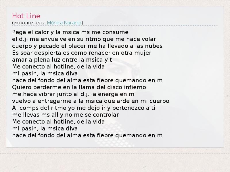 Pega el calor y la msica ms me consume el d.j. me envuelve en su ritmo que me hace volar cuerpo y pecado el placer me ha llevado a las nubes Es soar despierta es como renacer en otra mujer amar a plena luz entre la msica y t Me conecto al hotline, de la vida mi pasin, la msica diva nace del fondo del alma esta fiebre quemando en m Quiero perderme en la llama del disco infierno me hace vibrar junto al d.j. la energa en m vuelvo a entregarme a la msica que arde en mi cuerpo Al comps del ritmo yo me dejo ir y pertenezco a ti me llevas ms all y no me se controlar Me conecto al hotline, de la vida mi pasin, la msica diva nace del fondo del alma esta fiebre quemando en m