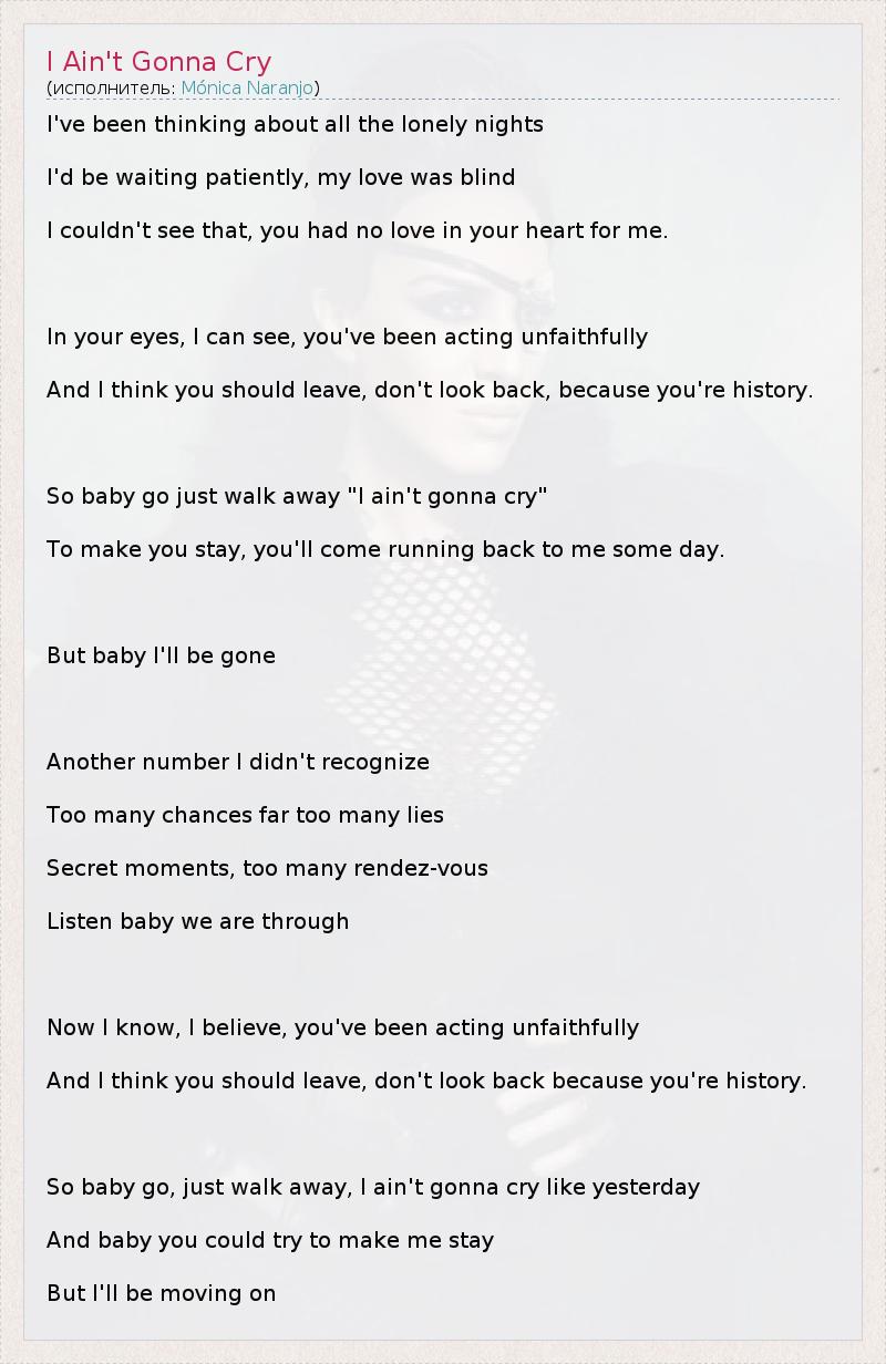 I've been thinking about all the lonely nights I'd be waiting patiently, my love was blind I couldn't see that, you had no love in your heart for me. In your eyes, I can see, you've been acting unfaithfully And I think you should leave, don't look back, because you're history. So baby go just walk away "I ain't gonna cry" To make you stay, you'll come running back to me some day. But baby I'll be gone Another number I didn't recognize Too many chances far too many lies Secret moments, too many rendez-vous Listen baby we are through Now I know, I believe, you've been acting unfaithfully And I think you should leave, don't look back because you're history. So baby go, just walk away, I ain't gonna cry like yesterday And baby you could try to make me stay But I'll be moving on