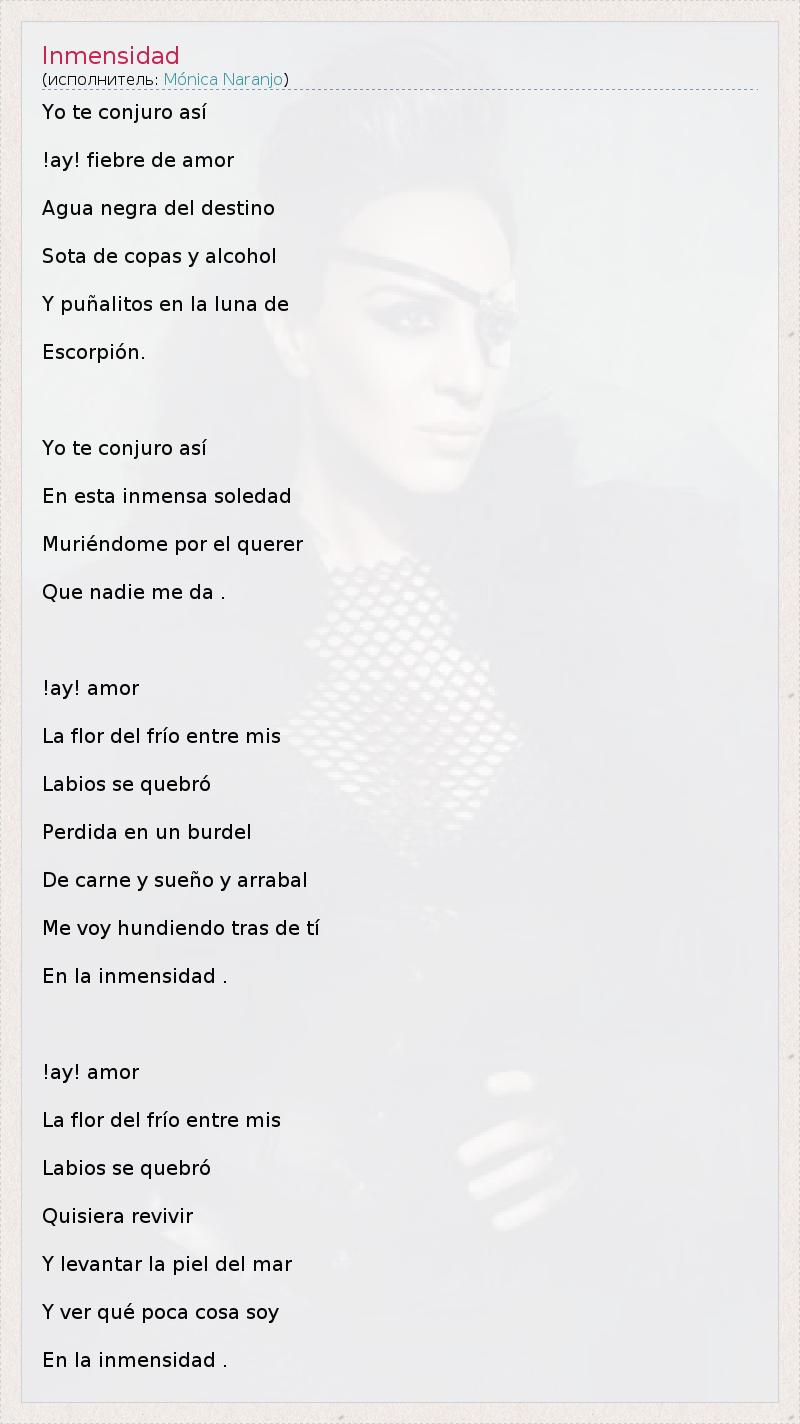 Yo te conjuro así !ay! fiebre de amor Agua negra del destino Sota de copas y alcohol Y puñalitos en la luna de Escorpión. Yo te conjuro así En esta inmensa soledad Muriéndome por el querer Que nadie me da . !ay! amor La flor del frío entre mis Labios se quebró Perdida en un burdel De carne y sueño y arrabal Me voy hundiendo tras de tí En la inmensidad . !ay! amor La flor del frío entre mis Labios se quebró Quisiera revivir Y levantar la piel del mar Y ver qué poca cosa soy En la inmensidad .