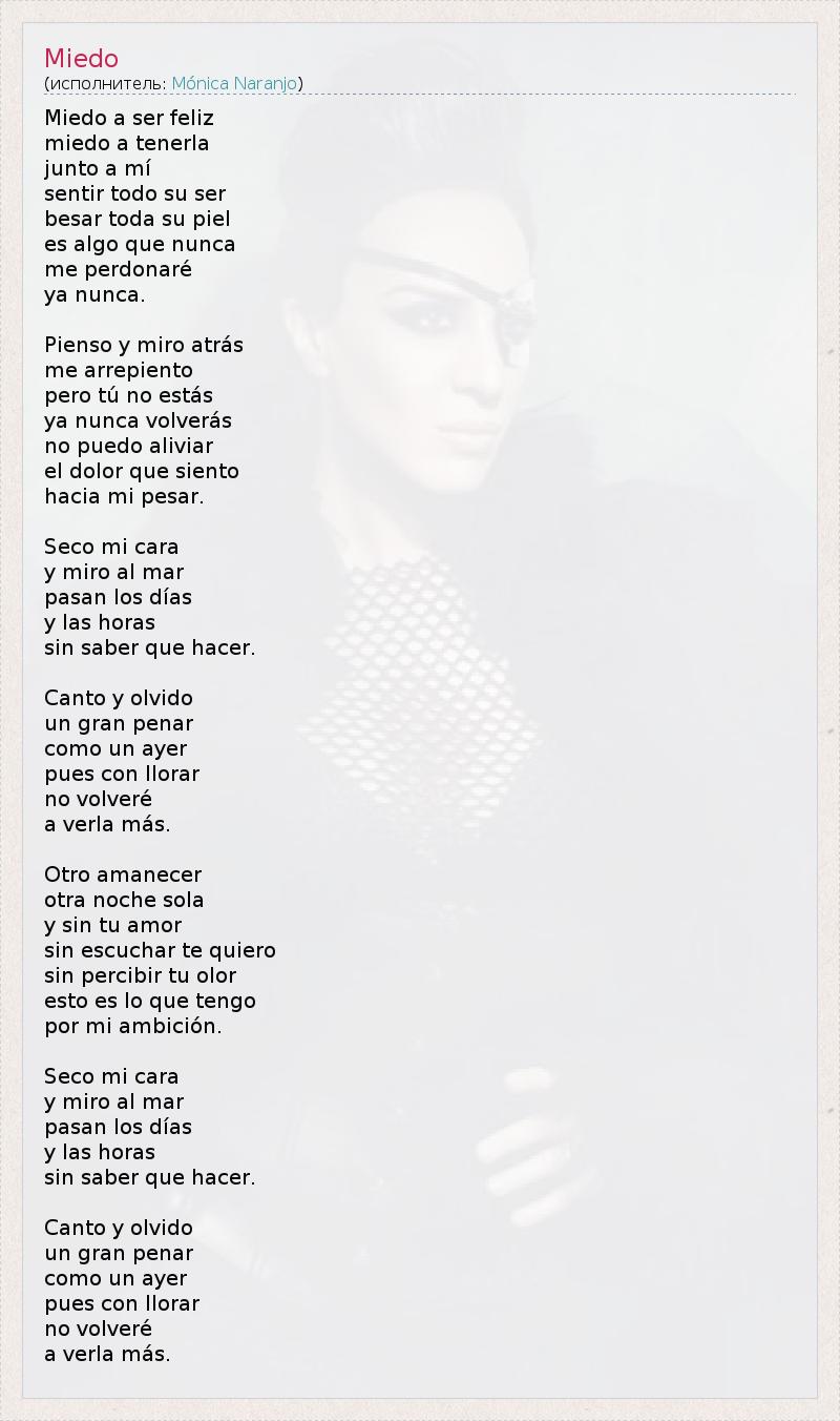 Miedo a ser feliz miedo a tenerla junto a mí sentir todo su ser besar toda su piel es algo que nunca me perdonaré ya nunca. Pienso y miro atrás me arrepiento pero tú no estás ya nunca volverás no puedo aliviar el dolor que siento hacia mi pesar. Seco mi cara y miro al mar pasan los días y las horas sin saber que hacer. Canto y olvido un gran penar como un ayer pues con llorar no volveré a verla más. Otro amanecer otra noche sola y sin tu amor sin escuchar te quiero sin percibir tu olor esto es lo que tengo por mi ambición. Seco mi cara y miro al mar pasan los días y las horas sin saber que hacer. Canto y olvido un gran penar como un ayer pues con llorar no volveré a verla más.
