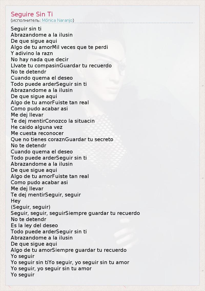 Seguir sin ti Abrazandome a la ilusin De que sigue aqui Algo de tu amorMil veces que te perdi Y adivino la razn No hay nada que decir Llvate tu compasinGuardar tu recuerdo No te detendr Cuando quema el deseo Todo puede arderSeguir sin ti Abrazandome a la ilusin De que sigue aqui Algo de tu amorFuiste tan real Como pudo acabar asi Me dej llevar Te dej mentirConozco la situacin He caido alguna vez Me cuesta reconocer Que no tienes coraznGuardar tu secreto No te detendr Cuando quema el deseo Todo puede arderSeguir sin ti Abrazandome a la ilusin De que sigue aqui Algo de tu amorFuiste tan real Como pudo acabar asi Me dej llevar Te dej mentirSeguir, seguir Hey (Seguir, seguir) Seguir, seguir, seguirSiempre guardar tu recuerdo No te detendr Es la ley del deseo Todo puede arderSeguir sin ti Abrazandome a la ilusin De que sigue aqui Algo de tu amorSiempre guardar tu recuerdo Yo seguir Yo seguir sin tiYo seguir, yo seguir sin tu amor Yo seguir, yo seguir sin tu amor Yo seguir