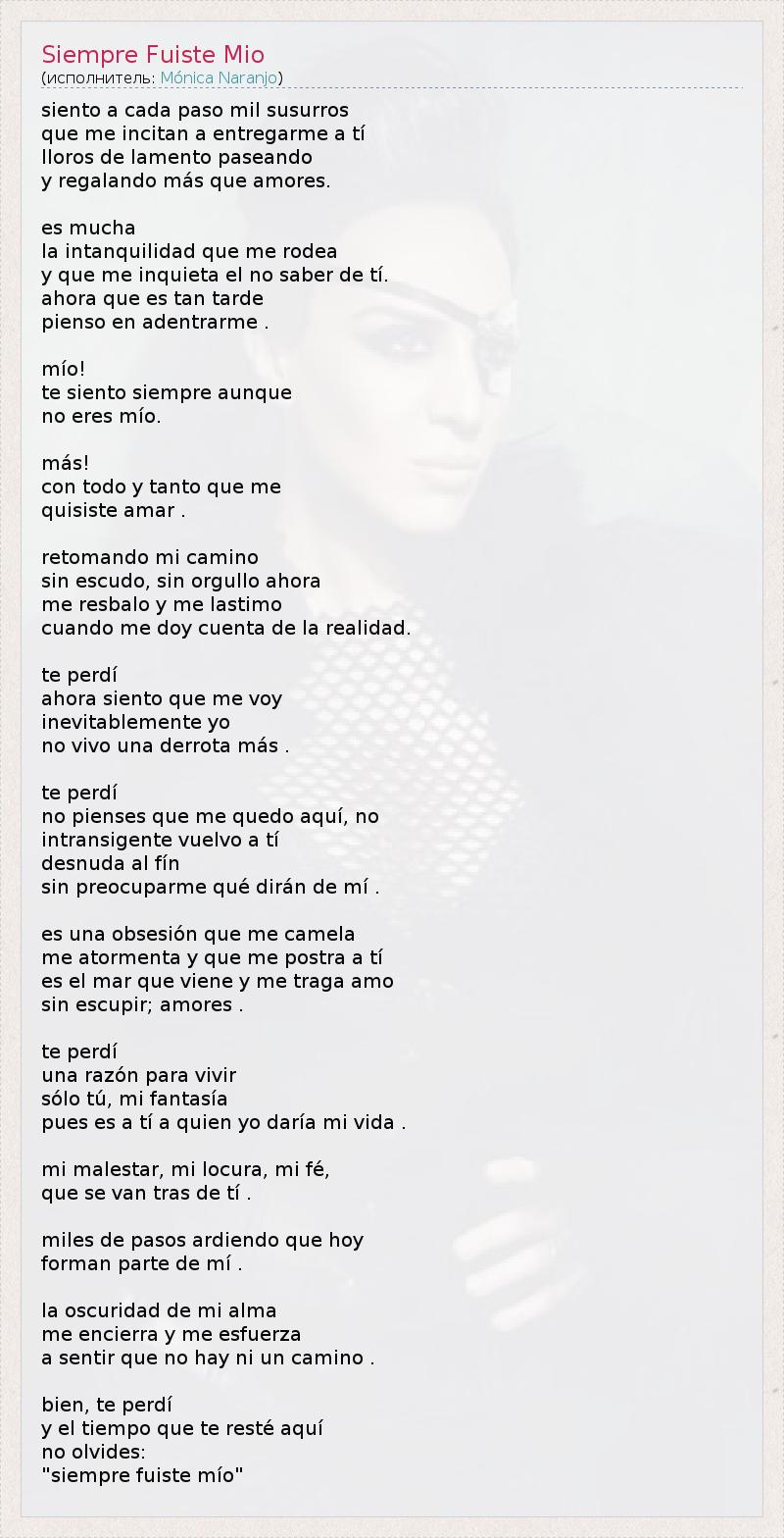 Siento через Када Пасо мил susurros Que мне incitan entregarme tí lloros де Lamento Paseando у regalando más Que Amores. ES Муха ла intanquilidad Que мне rodea у меня не Que inquieta эль нет сабля де Ti. Ahora Que эс загар Тард pienso ан adentrarme. Mio! те Siento Siempre Aunque нет Eres Mio. más! кон TODO у танто Que меня quisiste Амар. retomando миль Камино грех эскудо, грех Orgullo Ahora мне resbalo у меня lastimo Cuando мне дой Cuenta-де-ла realidad. те perdí Ahora Siento Que мне Voy inevitablemente лет нет естественных уна derrota más. те perdí нет pienses Que мне quedo aquí, нет intransigente Vuelvo tí Desnuda аль FIN грех preocuparme qué Диран де ИМ. ES уна Obsesion Que мне Camela мне atormenta у Que мне postra tí ES-эль-Мар Que Viene у меня traga АМО грех escupir; Сука. те perdí уна Razon пункт Vivir Соло Вт, миль Fantasía Pues эс tí Quien лет Дарья ми вида. миль malestar, ми Locura, ми Fe, Que SE ван де Tras Ti. миль де PASOS ardiendo Que хой Форман одностороннем де ИМ. ла-де-oscuridad миль альма мне encierra у меня esfuerza Sentir Que нет сена Ni ООН Камино. Bien, т.е perdí у Тьемпо Que те Reste aquí нет olvides: & Quot; Siempre Fuiste Mio & Quot;