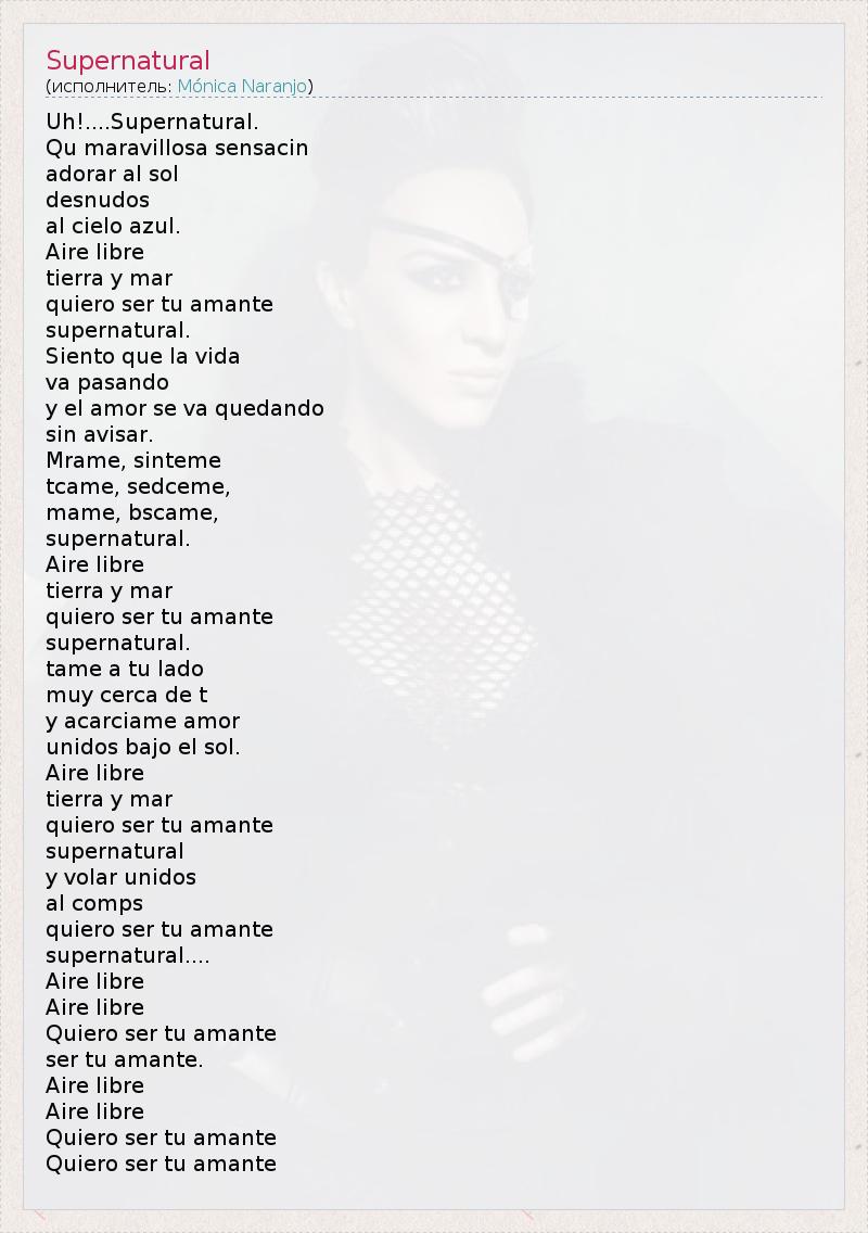 Uh!....Supernatural. Qu maravillosa sensacin adorar al sol desnudos al cielo azul. Aire libre tierra y mar quiero ser tu amante supernatural. Siento que la vida va pasando y el amor se va quedando sin avisar. Mrame, sinteme tcame, sedceme, mame, bscame, supernatural. Aire libre tierra y mar quiero ser tu amante supernatural. tame a tu lado muy cerca de t y acarciame amor unidos bajo el sol. Aire libre tierra y mar quiero ser tu amante supernatural y volar unidos al comps quiero ser tu amante supernatural.... Aire libre Aire libre Quiero ser tu amante ser tu amante. Aire libre Aire libre Quiero ser tu amante Quiero ser tu amante