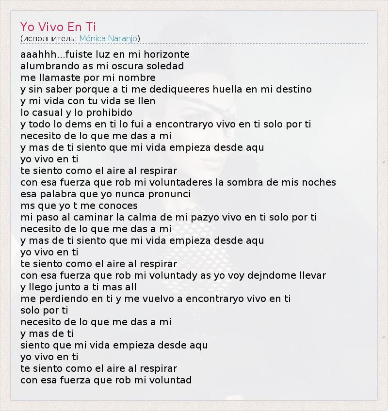 aaahhh...fuiste luz en mi horizonte alumbrando as mi oscura soledad me llamaste por mi nombre y sin saber porque a ti me dediqueeres huella en mi destino y mi vida con tu vida se llen lo casual y lo prohibido y todo lo dems en ti lo fui a encontraryo vivo en ti solo por ti necesito de lo que me das a mi y mas de ti siento que mi vida empieza desde aqu yo vivo en ti te siento como el aire al respirar con esa fuerza que rob mi voluntaderes la sombra de mis noches esa palabra que yo nunca pronunci ms que yo t me conoces mi paso al caminar la calma de mi pazyo vivo en ti solo por ti necesito de lo que me das a mi y mas de ti siento que mi vida empieza desde aqu yo vivo en ti te siento como el aire al respirar con esa fuerza que rob mi voluntady as yo voy dejndome llevar y llego junto a ti mas all me perdiendo en ti y me vuelvo a encontraryo vivo en ti solo por ti necesito de lo que me das a mi y mas de ti siento que mi vida empieza desde aqu yo vivo en ti te siento como el aire al respirar con esa fuerza que rob mi voluntad