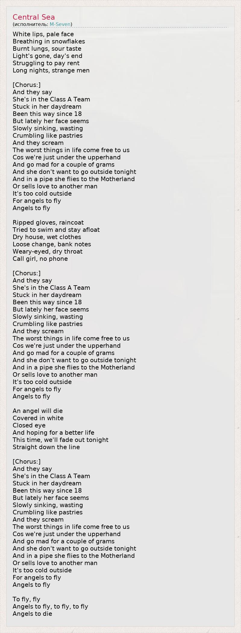 Белые губы, бледное лицо, Вдыхает снежные хлопья, Сожженные легкие, кислый вкус. Стало темно, кончился день, Борется, чтобы платить за квартиру, Долгие ночи, незнакомые люди... [Припев:] Говорят, Что она в Команде Класса А, 1 Застряла в своих грезах, Делает это с 18 лет. Но в последнее время ее лицо кажется Медленно тонущим, изнуренным, Крошащимся, как пирожные. Они кричат. Худшее, что может случиться в жизни, достается нам бесплатно, Потому что мы все под чьим-то влиянием И сходим с ума, чтобы достать пару граммов. Она не хочет выходить из дома сегодня вечером. И на трубке 2 она полетит на родину Или продаст любовь другому мужчине. А на улице так холодно Для полетов ангелов, Полетов ангелов... Рваные перчатки, дождевик, Попыталась плыть и остаться на плаву. Сухой дом, влажная одежда. Мелкие деньги, банкноты, Усталые глаза, сухое горло. Девушка по вызову, без телефона. [Припев:] Говорят, Что она в Команде Класса А, Застряла в своих грезах, Делает это с 18 лет. Но в последнее время ее лицо кажется Медленно тонущим, изнуренным, Крошащимся, как пирожные. Они кричат. Худшее, что может случиться в жизни, достается нам бесплатно, Потому что мы все под чьим-то влиянием И сходим с ума, чтобы достать пару граммов. Она не хочет выходить из дома сегодня вечером. И на трубке она полетит на родину Или продаст любовь другому мужчине. А на улице так холодно Для полетов ангелов, Полетов ангелов... Ангел умрет, Одетый в белое, С закрытыми глазами, Надеясь на лучшую жизнь. В этот раз мы постепенно уйдем этим вечером, Раз и на всегда. [Припев:] Говорят, Что она в Команде Класса А, Застряла в своих грезах, Делает это с 18 лет. Но в последнее время ее лицо кажется Медленно тонущим, изнуренным, Крошащимся, как пирожные. Они кричат. Худшее, что может случиться в жизни, достается нам бесплатно, Потому что мы все под чьим-то влиянием И сходим с ума, чтобы достать пару граммов. Она не хочет выходить из дома сегодня вечером. И на трубке она полетит на родину Или продаст любовь другому мужчине. А на улице так холодно Для полетов ангелов, Полетов ангелов... Для полетов, полетов, Для полетов ангелов... Для гибели ангелов... 1 - класс А – одна из трех групп наркотических средств по классификации в Великобритании. К нему относятся ЛСД, экстази, героин, метадон, кокаин и др. Речь о том, что героиня песни употребляет героин 2 - трубка для затяжки героином