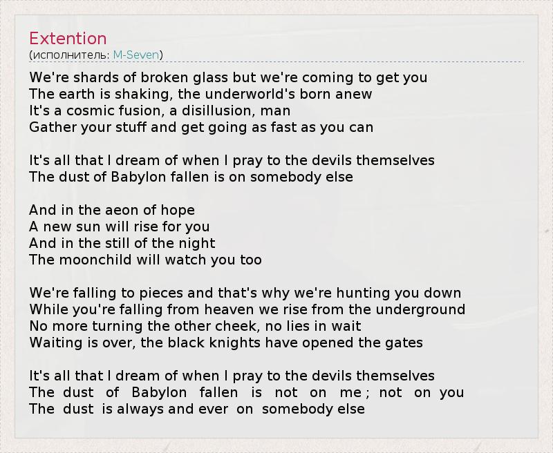 Мы осколки разбитого стекла, но мы пришли за тобой. Земля дрожит, преисподняя рождается заново. Это вселенское слияние, крушение иллюзий, человек: Собирайся и приступай к делу как можно скорее! Это всё, о чём я мечтаю, когда молюсь самим дьяволам; За прах павшего Вавилона расплатится кто-нибудь другой. И в убежище надежды Новое солнце взойдёт для тебя, И в тишине ночи Лунатик будет тоже следить за тобой. Мы распадаемся на части, вот почему мы преследуем тебя. Пока ты падаешь с небес, мы восстаём из ада, Хватит подставлять другую щёку, хватит ждать в засаде, Ожидание кончилось, чёрные рыцари открыли врата. Это всё, о чём я мечтаю, когда молюсь самим дьяволам; За прах павшего Вавилона буду платить не я - и не ты, За прах извечно и всегда расплачивается кто-то другой.