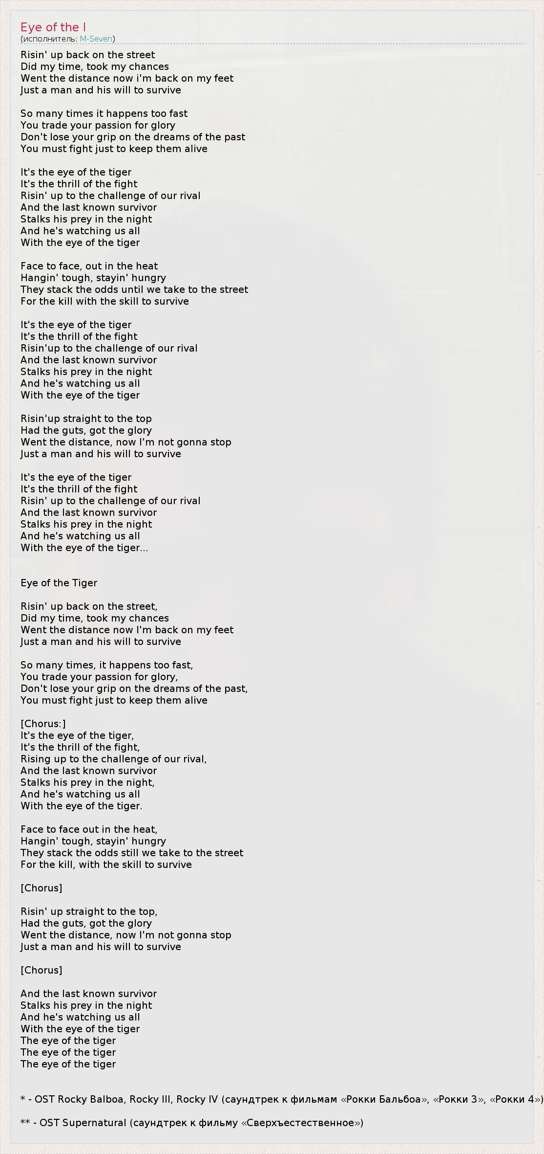 Risin' up back on the street Did my time, took my chances Went the distance now i'm back on my feet Just a man and his will to survive So many times it happens too fast You trade your passion for glory Don't lose your grip on the dreams of the past You must fight just to keep them alive It's the eye of the tiger It's the thrill of the fight Risin' up to the challenge of our rival And the last known survivor Stalks his prey in the night And he's watching us all With the eye of the tiger Face to face, out in the heat Hangin' tough, stayin' hungry They stack the odds until we take to the street For the kill with the skill to survive It's the eye of the tiger It's the thrill of the fight Risin'up to the challenge of our rival And the last known survivor Stalks his prey in the night And he's watching us all With the eye of the tiger Risin'up straight to the top Had the guts, got the glory Went the distance, now I'm not gonna stop Just a man and his will to survive It's the eye of the tiger It's the thrill of the fight Risin' up to the challenge of our rival And the last known survivor Stalks his prey in the night And he's watching us all With the eye of the tiger... Eye of the Tiger Risin' up back on the street, Did my time, took my chances Went the distance now I'm back on my feet Just a man and his will to survive So many times, it happens too fast, You trade your passion for glory, Don't lose your grip on the dreams of the past, You must fight just to keep them alive [Chorus:] It's the eye of the tiger, It's the thrill of the fight, Rising up to the challenge of our rival, And the last known survivor Stalks his prey in the night, And he's watching us all With the eye of the tiger. Face to face out in the heat, Hangin' tough, stayin' hungry They stack the odds still we take to the street For the kill, with the skill to survive [Chorus] Risin' up straight to the top, Had the guts, got the glory Went the distance, now I'm not gonna stop Just a man and his will to survive [Chorus] And the last known survivor Stalks his prey in the night And he's watching us all With the eye of the tiger The eye of the tiger The eye of the tiger The eye of the tiger * - OST Rocky Balboa, Rocky III, Rocky IV (саундтрек к фильмам «Рокки Бальбоа», «Рокки 3», «Рокки 4») ** - OST Supernatural (саундтрек к фильму «Сверхъестественное»)