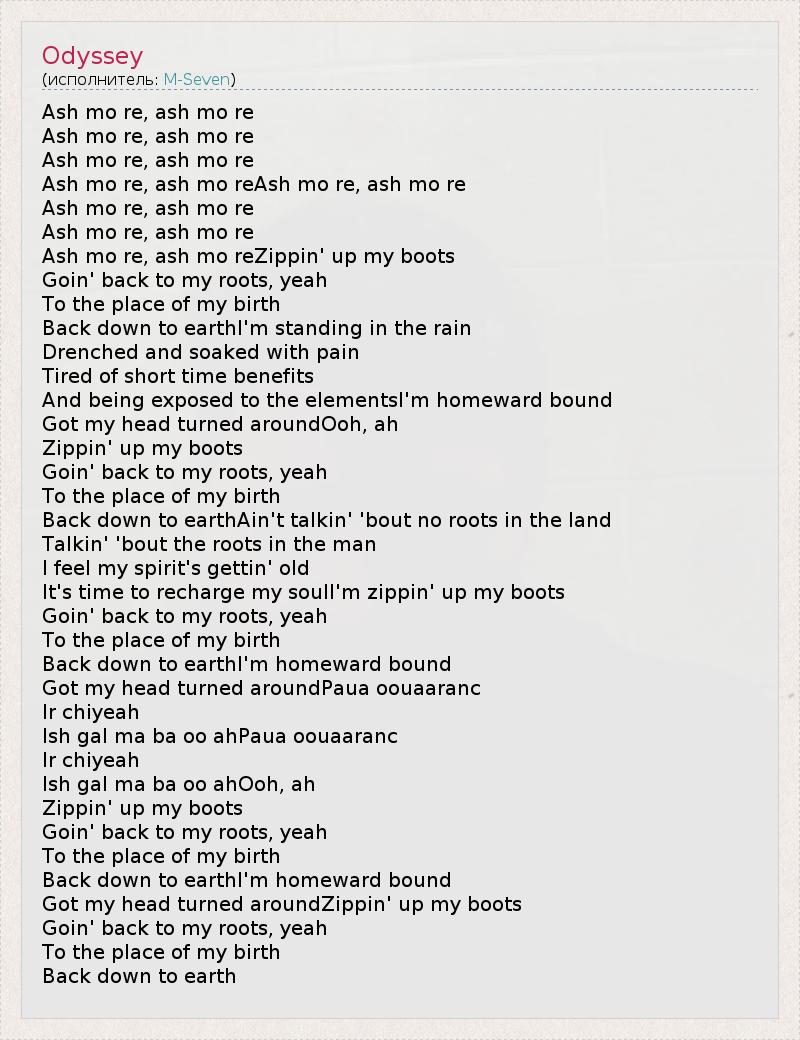 Ash mo re, ash mo re Ash mo re, ash mo re Ash mo re, ash mo re Ash mo re, ash mo reAsh mo re, ash mo re Ash mo re, ash mo re Ash mo re, ash mo re Ash mo re, ash mo reZippin' up my boots Goin' back to my roots, yeah To the place of my birth Back down to earthI'm standing in the rain Drenched and soaked with pain Tired of short time benefits And being exposed to the elementsI'm homeward bound Got my head turned aroundOoh, ah Zippin' up my boots Goin' back to my roots, yeah To the place of my birth Back down to earthAin't talkin' 'bout no roots in the land Talkin' 'bout the roots in the man I feel my spirit's gettin' old It's time to recharge my soulI'm zippin' up my boots Goin' back to my roots, yeah To the place of my birth Back down to earthI'm homeward bound Got my head turned aroundPaua oouaaranc Ir chiyeah Ish gal ma ba oo ahPaua oouaaranc Ir chiyeah Ish gal ma ba oo ahOoh, ah Zippin' up my boots Goin' back to my roots, yeah To the place of my birth Back down to earthI'm homeward bound Got my head turned aroundZippin' up my boots Goin' back to my roots, yeah To the place of my birth Back down to earth