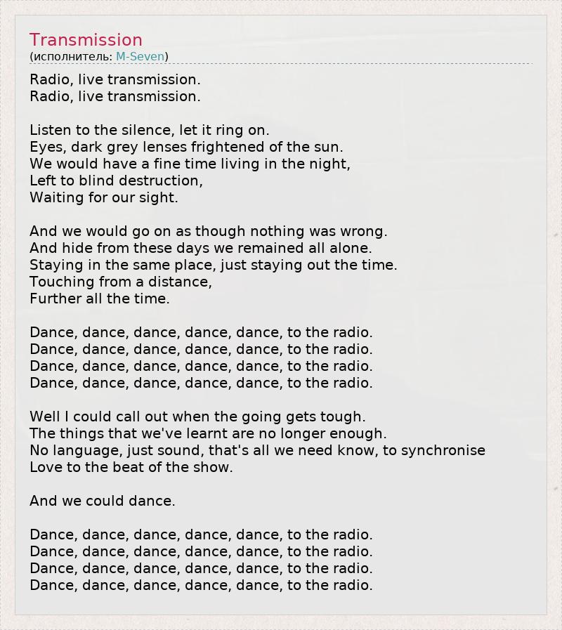 Radio, live transmission. Radio, live transmission. Listen to the silence, let it ring on. Eyes, dark grey lenses frightened of the sun. We would have a fine time living in the night, Left to blind destruction, Waiting for our sight. And we would go on as though nothing was wrong. And hide from these days we remained all alone. Staying in the same place, just staying out the time. Touching from a distance, Further all the time. Dance, dance, dance, dance, dance, to the radio. Dance, dance, dance, dance, dance, to the radio. Dance, dance, dance, dance, dance, to the radio. Dance, dance, dance, dance, dance, to the radio. Well I could call out when the going gets tough. The things that we've learnt are no longer enough. No language, just sound, that's all we need know, to synchronise Love to the beat of the show. And we could dance. Dance, dance, dance, dance, dance, to the radio. Dance, dance, dance, dance, dance, to the radio. Dance, dance, dance, dance, dance, to the radio. Dance, dance, dance, dance, dance, to the radio.