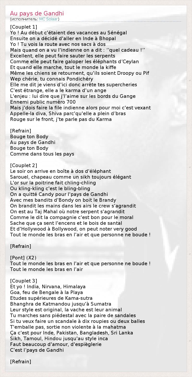 [Couplet 1] Yo ! Au début c'étaient des vacances au Sénégal Ensuite on a décidé d'aller en Inde à Bhopal Yo ! Tu vois la route avec nos sacs à dos Mais quand on a vu l'indienne on a dit : ‘’quel cadeau !’’ Excellent, elle peut faire sauter les serpents Comme elle peut faire galoper les éléphants d’Ceylan Et quand elle marche, tout le monde la kiffe Même les chiens se retournent, qu'ils soient Droopy ou Pif Wep chérie, tu connais Pondichéry Elle me dit je viens d'ici donc arrête tes supercheries C'est étrange, elle a le karma d'un ange L'enjeu : lui dire que j'l'aime sur les bords du Gange Ennemi public numéro 700 Mais j'dois faire la file indienne alors pour moi c'est vexant Appelle-la diva, Shiva parc'qu'elle a plein d’bras Rouge sur le front, j'te parle pas du Karma [Refrain] Bouge ton Body Au pays de Gandhi Bouge ton Body Comme dans tous les pays [Couplet 2] Le soir on arrive en boîte à dos d'éléphant Sarouel, chapeau comme un sikh toujours élégant L'or sur la poitrine fait chling-chling Ou kling-kling c'est le bling-bling On a quitté Candy pour l'pays de Gandhi Avec mes bandits d'Bondy on boit le Brandy On brandit les mains dans les airs le crew s'agrandit On est au Taj Mahal où notre serpent s'agrandit Comme le dit la compagnie c'est bon pour le moral Sache que ça sent l'encens et le bois de santal Et d'Hollywood à Bollywood, on peut noter very good Tout le monde les bras en l'air et que personne ne boude ! [Refrain] [Pont] (X2) Tout le monde les bras en l'air et que personne ne boude ! Tout le monde les bras en l'air [Couplet 3] Et yo ! India, Nirvana, Himalaya Goa, feu de Bengale à la Playa Etudes supérieures de Kama-sutra Bhanghra de Katmandou jusqu'à Sumatra Leur style est original, la vache est leur animal Tu marches sans piédestal avec la paire de sandales Si tu veux faire un scandale à dix roupies ou deux balles T'emballe pas, sortie non violente à la mahatma Ça c'est pour Inde, Pakistan, Bangladesh, Sri Lanka Sikh, Tamoul, Hindou jusqu'au style inca Faut beaucoup d'amour, d'espièglerie C'est l’pays de Gandhi [Refrain]
