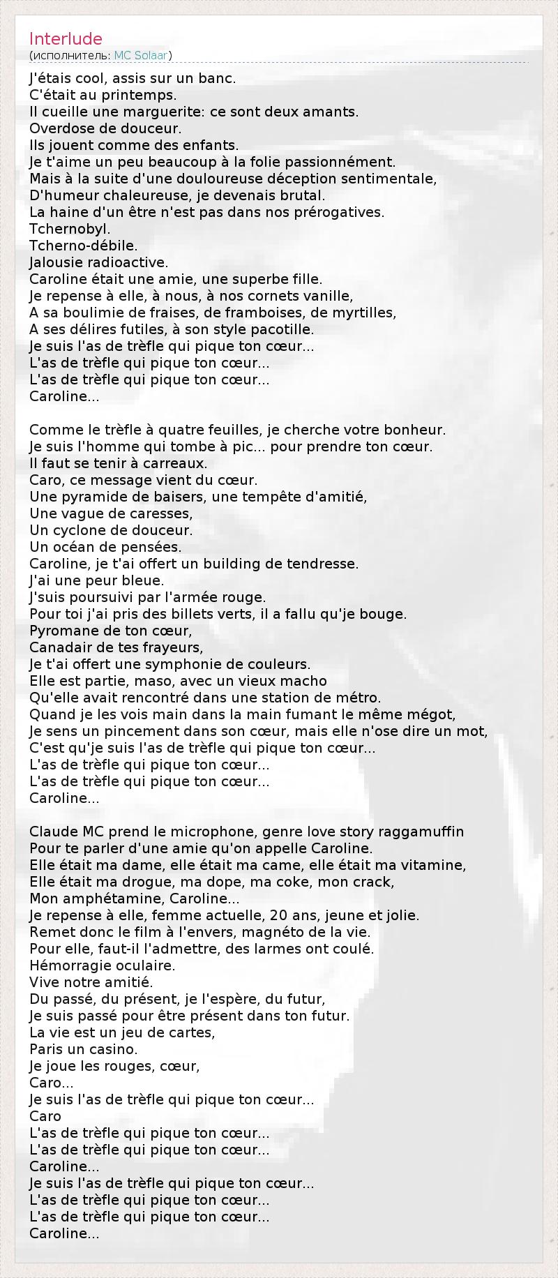 Я прохлаждался, сидя на скамейке. Это было весной. Он сорвал ромашку: это были двое влюбленных. Передозировка нежности. Они играют, как дети. Я люблю тебя с безумной страстью. Но после болезненного разочарования в любви, Пылая, я стал жестоким. Ненависть к существованию для нас не преимущество. Чернобыльская АЭС. Черно-дебильно. Радиоактивная ревность. Каролина была другом, прекрасная девушка. Я снова думаю о ней, о нас, наших ванильных трубочках, О ее страсти к клубнике, малине, чернике, О ее бессмысленном восторге, о ее безвкусном стиле. Я туз треф, который проткнул твое сердце... Туз треф, который проткнул твое сердце... Туз треф, который проткнул твое сердце... Каролина... Я ищу ваше счастье как четырехлистный клевер. Я человек, который попал в точку... чтобы отнять твое сердце. Нужно ухватиться за землю. Каро(1) - это послание от сердца. Пирамида поцелуев, буря привязанности, Волна ласк, Циклон нежности. Океан намерений. Каролина, я подарил тебе небоскреб нежности. Я в ужасе. Меня преследует Красная Армия. Для тебя я заработаю зеленые бумажки(2), мне нужно было поторопиться. Поджигатель твоего сердца, Тушит(3) твои страхи, Я предложил тебе симфонию цветов. Она, мазохистка, ушла со старым мачо, Которого она встретила в метро. Когда я вижу, как рука об руку они курят один и тот же окурок, Я чувствую покалывание в сердце, но она не смеет сказать ни слова. Я туз треф, который проткнул твое сердце... Туз треф, который проткнул твое сердце... Туз треф, который проткнул твое сердце... Каролина ... Клод MC берет микрофон, в жанре истории любви раггамаффин(4), Чтобы рассказать вам о друге, которого зовут Каролина. Она была моей дамой, она была моим наркотиком, она была моим витамином, Она была моим наркотиком, моим допингом, моим кокаином, моим крэком(5), Моим амфетамином(6). Каролина... Я снова думаю о ней, настоящей женщине двадцати лет, молодой и хорошенькой. Будто представляю фильм, прокрученный обратно, жизнь, записанная на пленке. Ради нее, признаю, у меня текли слезы. Глазное кровоизлияние. Да здравствует наша дружба! Прошлая, настоящая, надеюсь и будущая Я ушел в прошлое, чтобы стать настоящим твоего будущего. Жизнь - это игра в карты В парижском казино. Я играю в красный, черви, Каро... Я туз треф, который проткнул твое сердце... Каро Туз треф, который проткнул твое сердце... Туз треф, который проткнул твое сердце... Каролина... Я туз треф, который проткнул твое сердце... Туз треф, который проткнул твое сердце... Туз треф, который проткнул твое сердце... Каролина... 1 - Сокращенное от "Каролина" 2 - Доллары США 3 - "Canadair" — самолёт для борьбы с лесными пожарами. 4 - Рагга, раггамаффин — стиль танцевальной музыки, первоначально ямайской, представляющий собой вариацию регги либо дэнсхолла, и отличающийся речитативным вокалом, преимущественно звучащим под аккомпанемент электронных инструментов. 5 - Форма выпуска кокаина 6 - Амфетамин — (А)льфа (м)етил (фе)нилэ(т)ил(амин) — лекарственное средство, стимулятор центральной нервной системы, является аналогом гормонов адреналина и норадреналина.