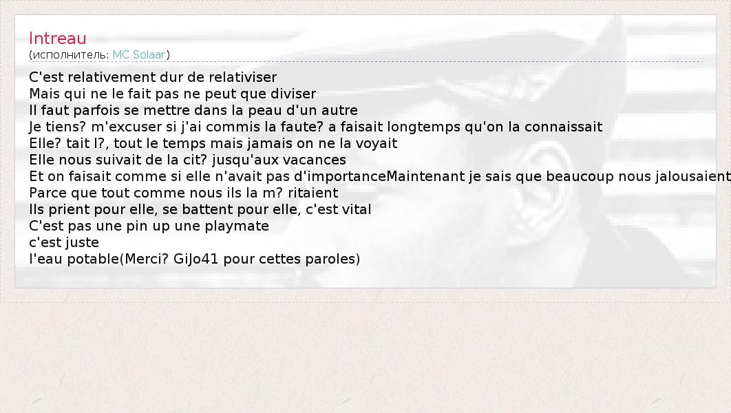 Это интересно:Во Франции существовали предпосылки появления такого стиля как рэп, ведь это страна трубадуров, которые славились богатствами языка и рифмы. Было необходимо лишь появление этого вдохновленного человека, который мог бы соединить свой талант со всей мощью поэтичного французского языка. По иронии судьбы этот человек появляется во Франции из Чада, минуя Сенегал. Он великолепно понимает... продолжение