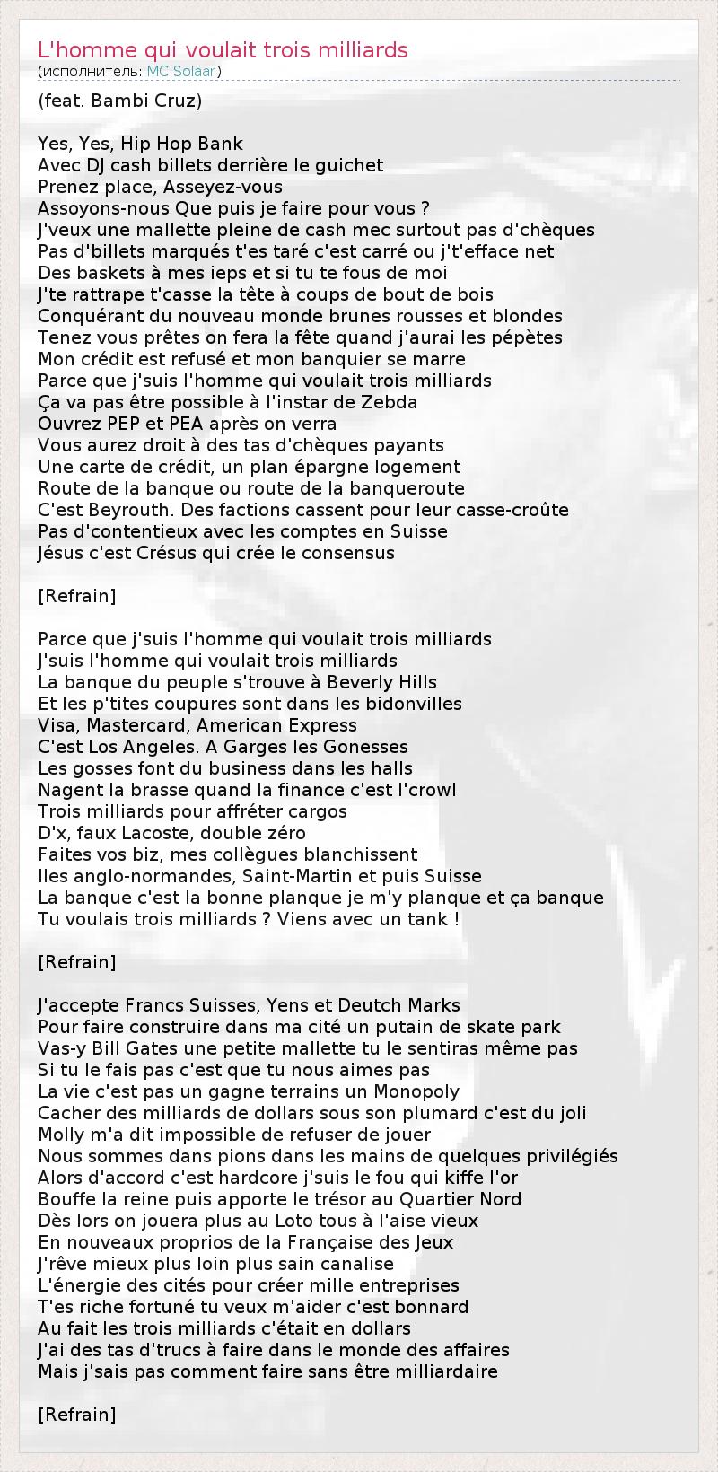 А как ты думаешь, о чем песня "L'homme qui voulait trois milliards" ?