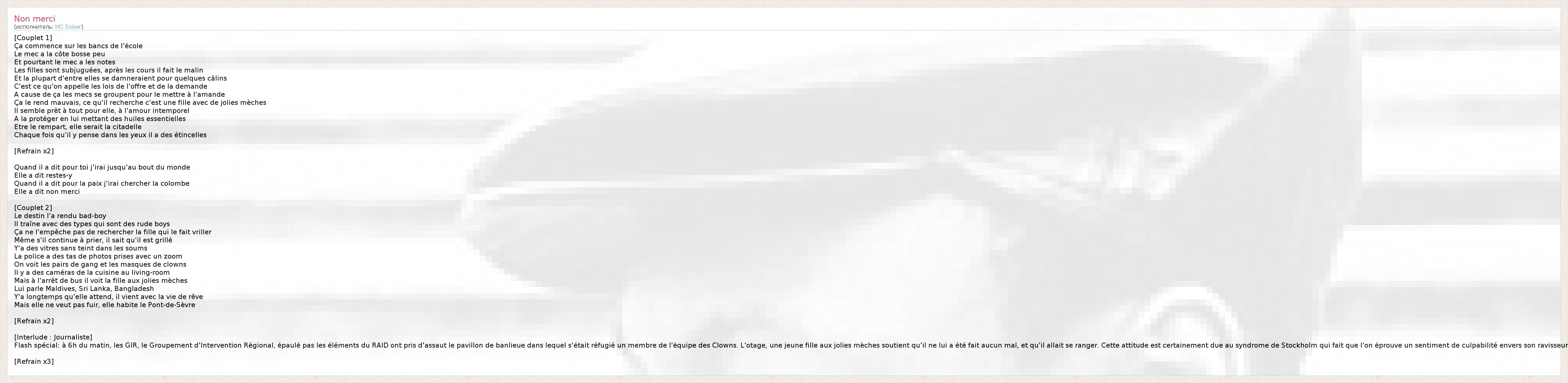 [Couplet 1] Ça commence sur les bancs de l'école Le mec a la côte bosse peu Et pourtant le mec a les notes Les filles sont subjuguées, après les cours il fait le malin Et la plupart d'entre elles se damneraient pour quelques câlins C'est ce qu'on appelle les lois de l'offre et de la demande A cause de ça les mecs se groupent pour le mettre à l'amande Ça le rend mauvais, ce qu'il recherche c'est une fille avec de jolies mèches Il semble prêt à tout pour elle, à l'amour intemporel A la protéger en lui mettant des huiles essentielles Etre le rempart, elle serait la citadelle Chaque fois qu'il y pense dans les yeux il a des étincelles [Refrain x2] Quand il a dit pour toi j'irai jusqu'au bout du monde Elle a dit restes-y Quand il a dit pour la paix j'irai chercher la colombe Elle a dit non merci [Couplet 2] Le destin l'a rendu bad-boy Il traîne avec des types qui sont des rude boys Ça ne l'empêche pas de rechercher la fille qui le fait vriller Même s'il continue à prier, il sait qu'il est grillé Y'a des vitres sans teint dans les soums La police a des tas de photos prises avec un zoom On voit les pairs de gang et les masques de clowns Il y a des caméras de la cuisine au living-room Mais à l'arrêt de bus il voit la fille aux jolies mèches Lui parle Maldives, Sri Lanka, Bangladesh Y'a longtemps qu'elle attend, il vient avec la vie de rêve Mais elle ne veut pas fuir, elle habite le Pont-de-Sèvre [Refrain x2] [Interlude : Journaliste] Flash spécial: à 6h du matin, les GIR, le Groupement d'Intervention Régional, épaulé pas les éléments du RAID ont pris d'assaut le pavillon de banlieue dans lequel s'était réfugié un membre de l'équipe des Clowns. L'otage, une jeune fille aux jolies mèches soutient qu'il ne lui a été fait aucun mal, et qu'il allait se ranger. Cette attitude est certainement due au syndrome de Stockholm qui fait que l'on éprouve un sentiment de culpabilité envers son ravisseur [Refrain x3]