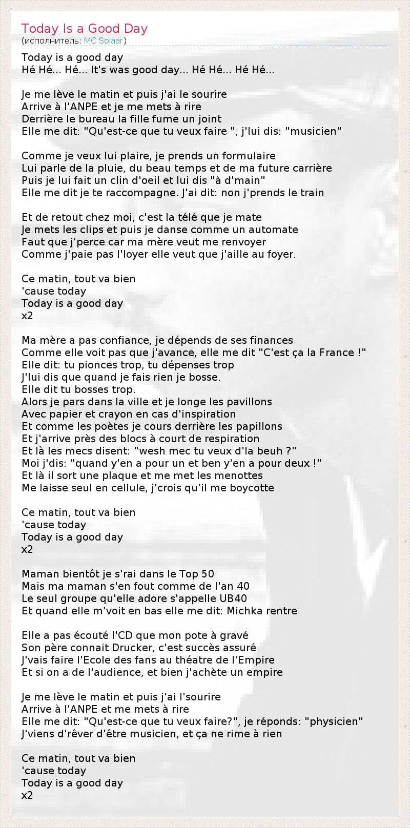 Сегодня хороший день! Эй, эй... Эй... Это был хороший день... Эй, эй... Эй, эй... Я встаю утром и улыбаюсь, Прихожу в ANPE (1) и начинаю смеяться. За стойкой девушка курит наркотик Она спрашивает: "Кем ты хочешь работать?" Я отвечаю: "Музыкантом" Я так хочу ей понравиться, я беру бланк, Говорю с ней о дожде, хорошей погоде и моей будущей карьере. Потом я подмигнул ей и сказал: "До скорого!" Она сказала: "Я провожу тебя". Я сказал: "Нет, я сяду на поезд" Вернувшись домой я смотрю телевизор, Я включаю клипы и танцую как робот. Нужно продвигаться, потому что мама хочет, чтобы я вернулся. Чтобы не тратить деньги на аренду, она хочет, чтобы я вернулся домой. Сегодня утром все будет хорошо, Потому что сегодня, Сегодня хороший день. х2 Мать не доверяет мне, я - зависящий от ее финансов. Как будто она не видит, что я продвигаюсь, она говорит: "Это Франция!" Она говорит: "Дружок, ты слишком много тратишь." Я говорю, что когда я ничего не делаю, я работаю. Она говорит, тогда ты слишком много работаешь. И я иду по городу, вдоль ларьков С бумагой и карандашом на случай вдохновения, И, как поэты, я бегаю за бабочками. Я с одышкой подбегаю к полицейскому участку, И тогда ребята говорят: "Эй, парень, ты действительно этого хочешь?" Я говорю: "Если найдется для одного, найдется и для двоих." И тогда он достал значок и надел на меня наручники, Меня кинули одного в камере, и, кажется, мне объявили бойкот. Сегодня утром все будет хорошо, Потому что сегодня, Сегодня хороший день. х2 Мама, скоро я буду среди лучших 50. Но моей маме все равно, как в 40-м году. Единственная группа, которую она любит, называется UB40 (2), И когда она видит меня здесь, внизу, она говорит: Мичка (3) возвращается. Она не слушала CD, которые записал мой приятель. Ее отец знаком с Друкером (4), это гарантированный успех. Я собираюсь создать школу фанатов в Театре Империи (5), А если у нас будет публика, я смогу купить власть. Я встаю утром и улыбаюсь, Прихожу в ANPE, и начинаю смеяться. Она спрашивает: "Кем ты хочешь работать?" Я отвечаю: "Физиком. Я хотел стать музыкантом, но из этого ничего не вышло..." Сегодня утром все будет хорошо, Потому что сегодня, Сегодня хороший день. х2 1 - ANPE — Agence Nationale pour l'Emploi (национальное агентство занятости) 2 - UB40— самая известная "белая" регги-группа. 3 - Michka Assayas — писатель и рок-критик 4 - Питер Фердинанд Друкер — американский учёный австрийского происхождения; экономист, публицист, педагог, один из самых влиятельных теоретиков менеджмента XX века. 5 - Le Théâtre de l'Empire — зал в Париже где проходили спектакли.