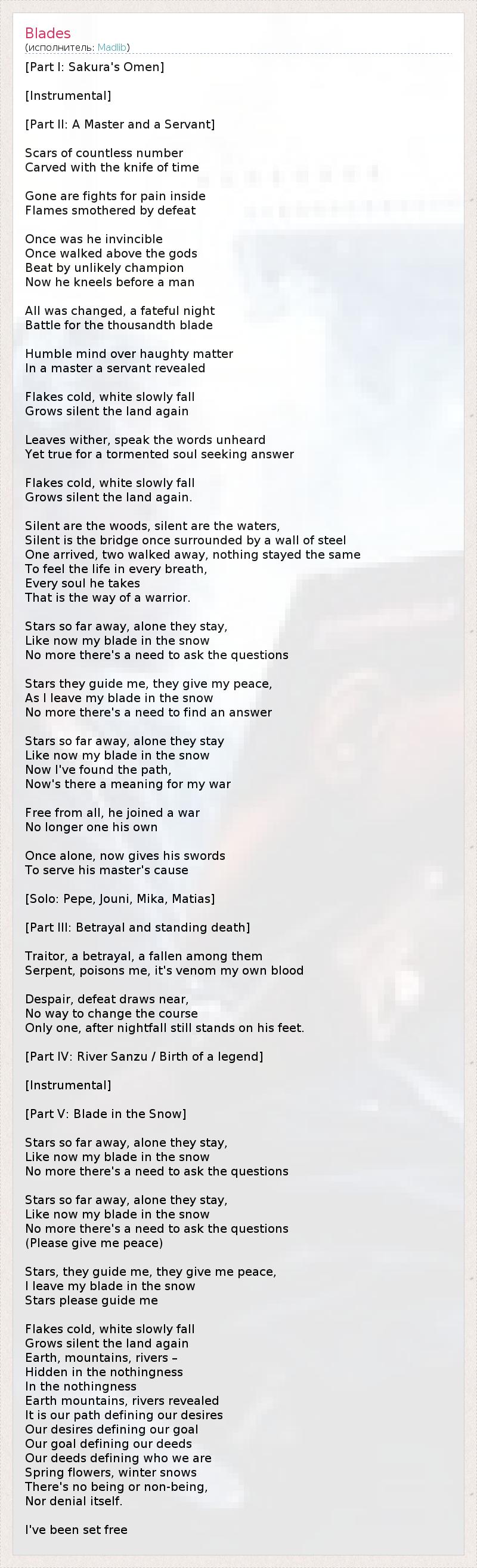 * В песне рассказывается легенда о Бэнкее, великом японском монахе-воине. Рассказывается, что Бэнкей пришел на мост Годзё в Киото, где разоружал каждого, кто владел мечом. Таким образом у него собралось ровно 999 лезвий. Но в один день на его пути встал Минамото-но Ёсицунэ, который победил его, а позднее Бэнкей стал его вассалом. Вместе они участвуют в войне, которую выигрывают, но позднее оба вынуждены скрываться от закона. В своей последней битве Бэнкей доблестно сражался и умер в положении стоя. Он так и остался непобежденным в рукопашном бою, он был убит лучником.