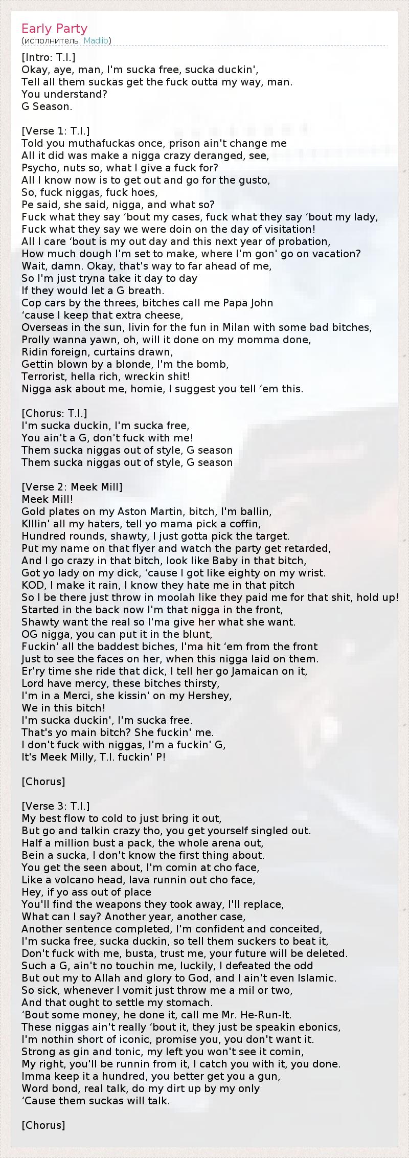 Okay, aye, man, I'm sucka free, sucka duckin',