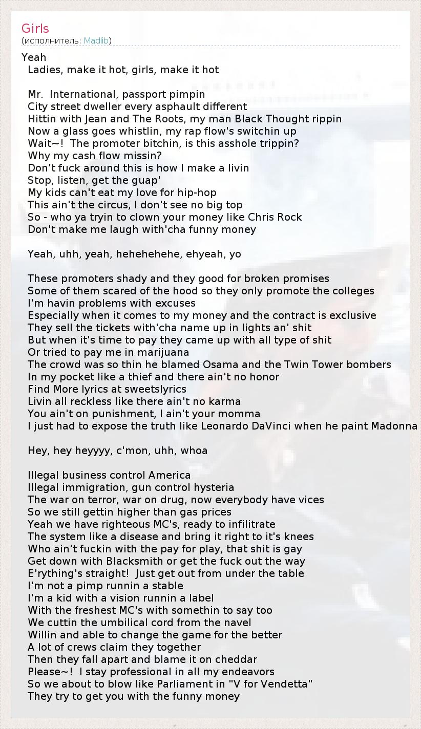 Это интересно:У него много имен, под которыми он издаётся (и лишь одно настоящее - Otis Jackson Jr.). Настоящие любители андеграунда знают, Madlib - парень непростой.Рождённый в г.Окснард, штат Калифорния (Oxnard, CA) сын певца R&B 60-х Отиса Джексона старшего (Otis Jackson Sr.), Madlib своим репертуаром игнорирует простую классификацию. Его первым проектом была широко известная в узких... продолжение