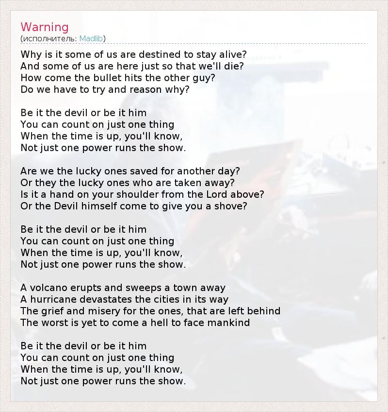 Why is it some of us are destined to stay alive? And some of us are here just so that we'll die? How come the bullet hits the other guy? Do we have to try and reason why? Be it the devil or be it him You can count on just one thing When the time is up, you'll know, Not just one power runs the show. Are we the lucky ones saved for another day? Or they the lucky ones who are taken away? Is it a hand on your shoulder from the Lord above? Or the Devil himself come to give you a shove? Be it the devil or be it him You can count on just one thing When the time is up, you'll know, Not just one power runs the show. A volcano erupts and sweeps a town away A hurricane devastates the cities in its way The grief and misery for the ones, that are left behind The worst is yet to come a hell to face mankind Be it the devil or be it him You can count on just one thing When the time is up, you'll know, Not just one power runs the show.