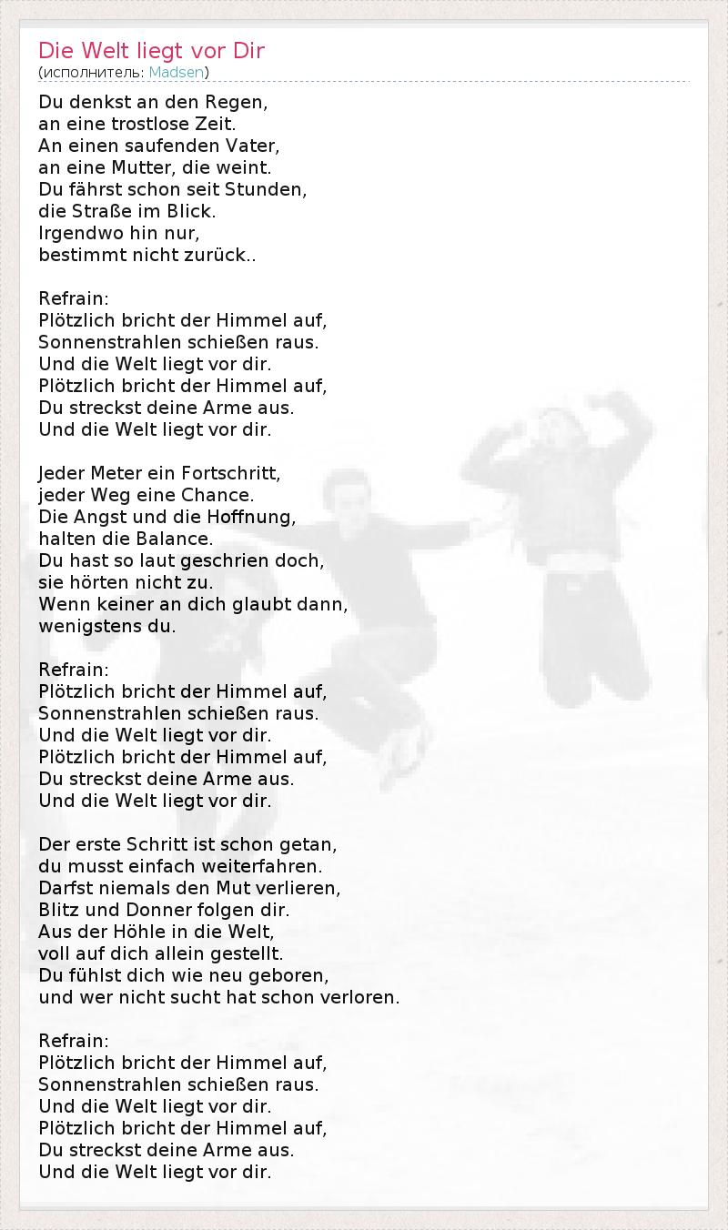 А как ты думаешь, о чем песня "Die Welt liegt vor Dir" ?