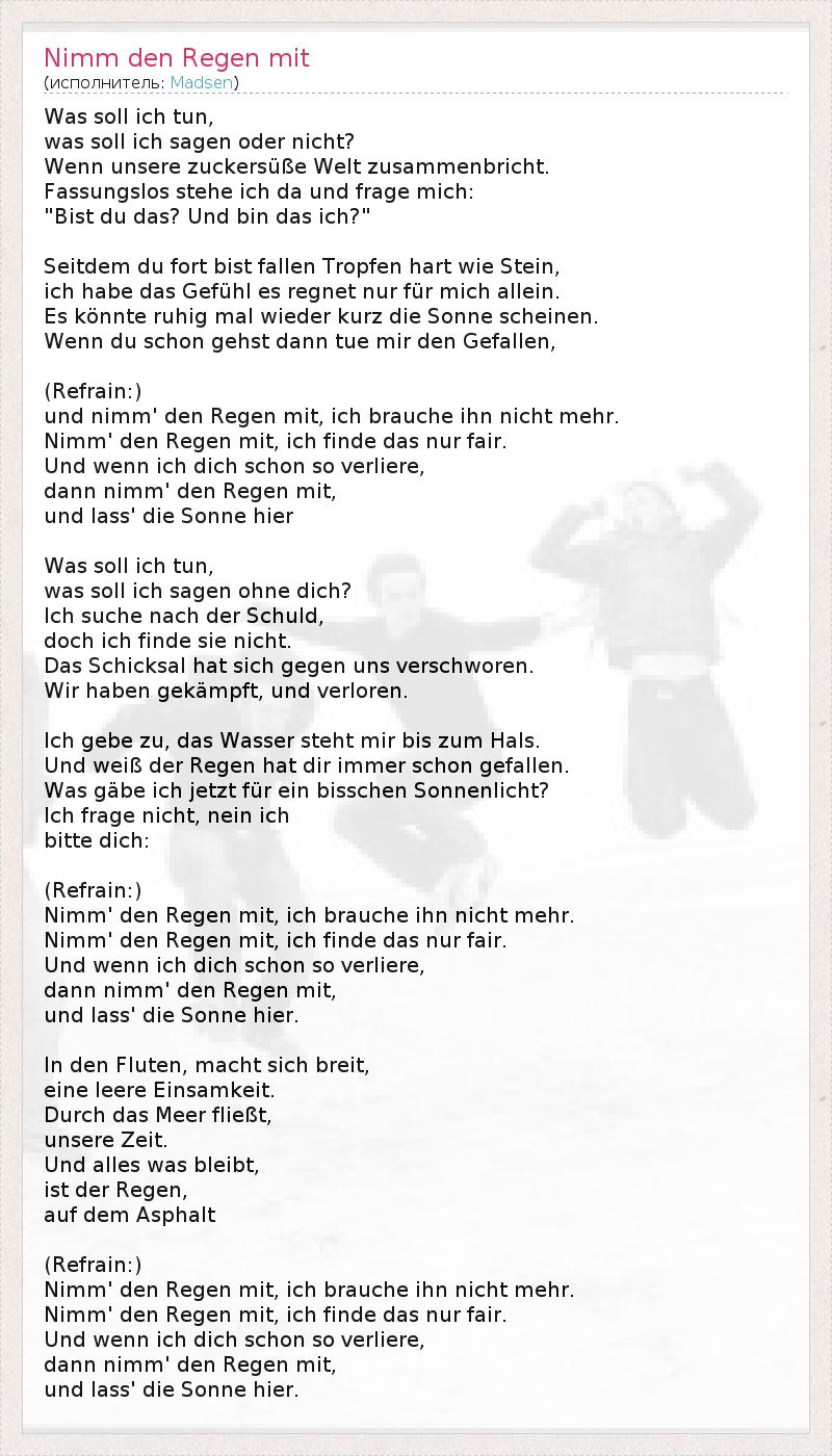 Был Soll Ich тун был Soll Ich Sagen Одер Nicht? Венна Unsere zuckersüße Welt zusammenbricht. Fassungslos stehe Ich унд да Frage Мичиган: & Quot; Bist дю дас? Und Ich бен & дас Quot; Seitdem дю Форт БИСТ упал Tropfen олень Wie Штайн, Ich хабе дас Gefühl эс RegNet нур фюр Мичиган Allein. Эс könnte Ruhig мал Wieder Kurz умереть Sonne scheinen. Венна дю Шон Данн gehst Вт мир ден Gefallen, (Припев :) унд nimm вертепом Реген мит, ич brauche IHN Nicht Mehr. Nimm 'ден Реген мит, ич Finde дас Нур справедливым. Und Ich Dich Венна Шон так verliere, Данн nimm 'ден Реген мит, унд девушка "умереть Sonne HIER Был Soll Ich тун был Soll Ich Sagen оЬпе Dich? Ich сучье нач дер Schuld, Дочь ич Finde Sie Nicht. Дас Schicksal шляпа Сич геген UNS verschworen. Wir Haben gekämpft, унд Verloren. Ich Гебе цу, дас Вассер steht мир бис Zum Галс. Und Вайс дер Реген шляпа реж Immer Шон gefallen. Был Гейб ич Jetzt für Эйн bisschen Sonnenlicht? Ich Frage Nicht, NEIN Ich Bitte Dich: (Припев :) Nimm 'ден Реген мит, ич brauche IHN Nicht Mehr. Nimm 'ден Реген мит, ич Finde дас Нур справедливым. Und Ich Dich Венна Шон так verliere, Данн nimm 'ден Реген мит, унд девушка "умереть Sonne HIER. В ден Fluten, Macht Сич Брейт, сделайте Leere Einsamkeit. Durch дас Меер fließt, Unsere Zeit. Und Alles был bleibt, IST дер Реген, Auf Dem Асфальт (Припев :) Nimm 'ден Реген мит, ич brauche IHN Nicht Mehr. Nimm 'ден Реген мит, ич Finde дас Нур справедливым. Und Ich Dich Венна Шон так verliere, Данн nimm 'ден Реген мит, унд девушка "умереть Sonne HIER.