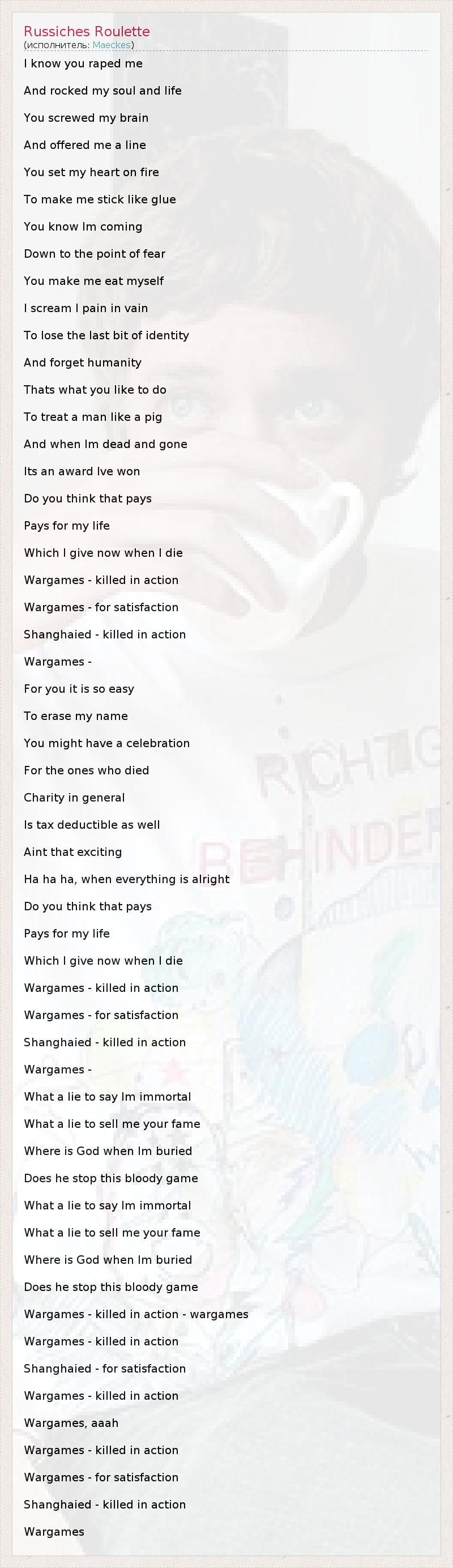 РУССКАЯ РУЛЕТКА Знаю, меня изнасиловал ты И вытряс всю душу и жизнь. Ты «вынес» мне мозг И довел до черты. Ты разжег в моем сердце пожар, Чтоб сделать липким как клей Ты знаешь, я на пути к Крайней степени страха Ты заставил меня есть себя, Крича от боли понапрасну, Чтоб потерять остатки личности И забыть о гуманности Вот чем тебе нравится заниматься - Обращаться с людьми как со свиньями А когда я умру, моя смерть Станет мне наградой Думаешь, когда я умру, это оплатит, Оплатит мою жизнь, Которую я отдаю сейчас? Военные игры – убит в бою, Военные игры – для удовлетворения, Опоили-окрутили – убит в бою, Военные игры Для тебя так легко Стереть мое имя, Возможно, у тебя праздник В честь каждого убитого. Благотворительность, в основном, Исключается из суммы, облагаемой налогом, Разве это не волнующе, Ха-ха, когда всё «тип-топ»? Думаешь, когда я умру, это оправдает, Оправдает мою жизнь, Которую я отдаю сейчас? Военные игры – убит в бою, Военные игры – для удовлетворения, Опоили-окрутили – убит в бою, Военные игры Что за ложь - говорить «Я – бессмертен», Что за ложь – ты продаешь мне свою славу, Где же Бог, когда я похоронен? Остановит ли сейчас он это кровавую игру? х 2 раза Военные игры – убит в бою, Военные игры – для удовлетворения, Опоили-окрутили – убит в бою, Военные игры х 3 раза