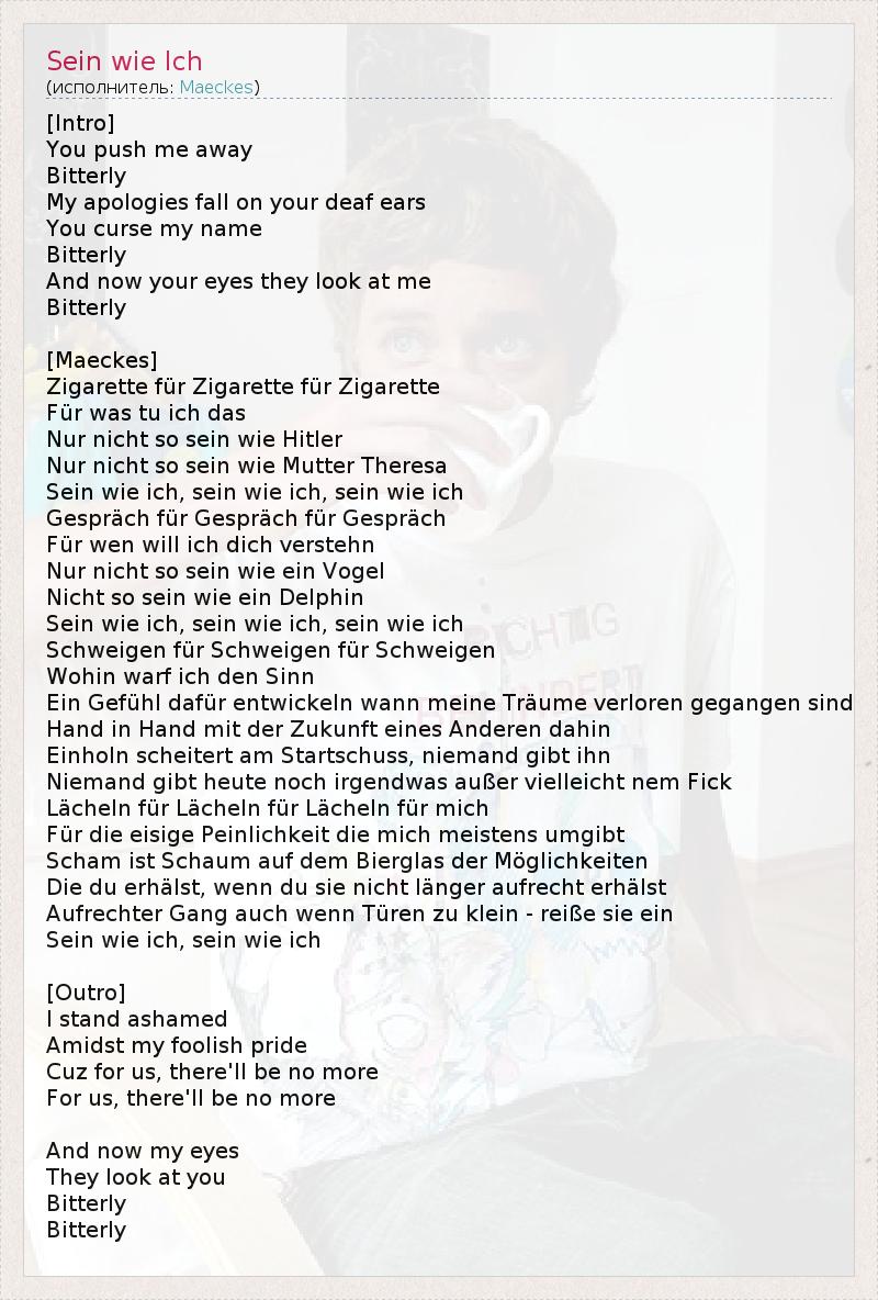 [Intro] You push me away Bitterly My apologies fall on your deaf ears You curse my name Bitterly And now your eyes they look at me Bitterly [Maeckes] Zigarette für Zigarette für Zigarette Für was tu ich das Nur nicht so sein wie Hitler Nur nicht so sein wie Mutter Theresa Sein wie ich, sein wie ich, sein wie ich Gespräch für Gespräch für Gespräch Für wen will ich dich verstehn Nur nicht so sein wie ein Vogel Nicht so sein wie ein Delphin Sein wie ich, sein wie ich, sein wie ich Schweigen für Schweigen für Schweigen Wohin warf ich den Sinn Ein Gefühl dafür entwickeln wann meine Träume verloren gegangen sind Hand in Hand mit der Zukunft eines Anderen dahin Einholn scheitert am Startschuss, niemand gibt ihn Niemand gibt heute noch irgendwas außer vielleicht nem Fick Lächeln für Lächeln für Lächeln für mich Für die eisige Peinlichkeit die mich meistens umgibt Scham ist Schaum auf dem Bierglas der Möglichkeiten Die du erhälst, wenn du sie nicht länger aufrecht erhälst Aufrechter Gang auch wenn Türen zu klein - reiße sie ein Sein wie ich, sein wie ich [Outro] I stand ashamed Amidst my foolish pride Cuz for us, there'll be no more For us, there'll be no more And now my eyes They look at you Bitterly Bitterly