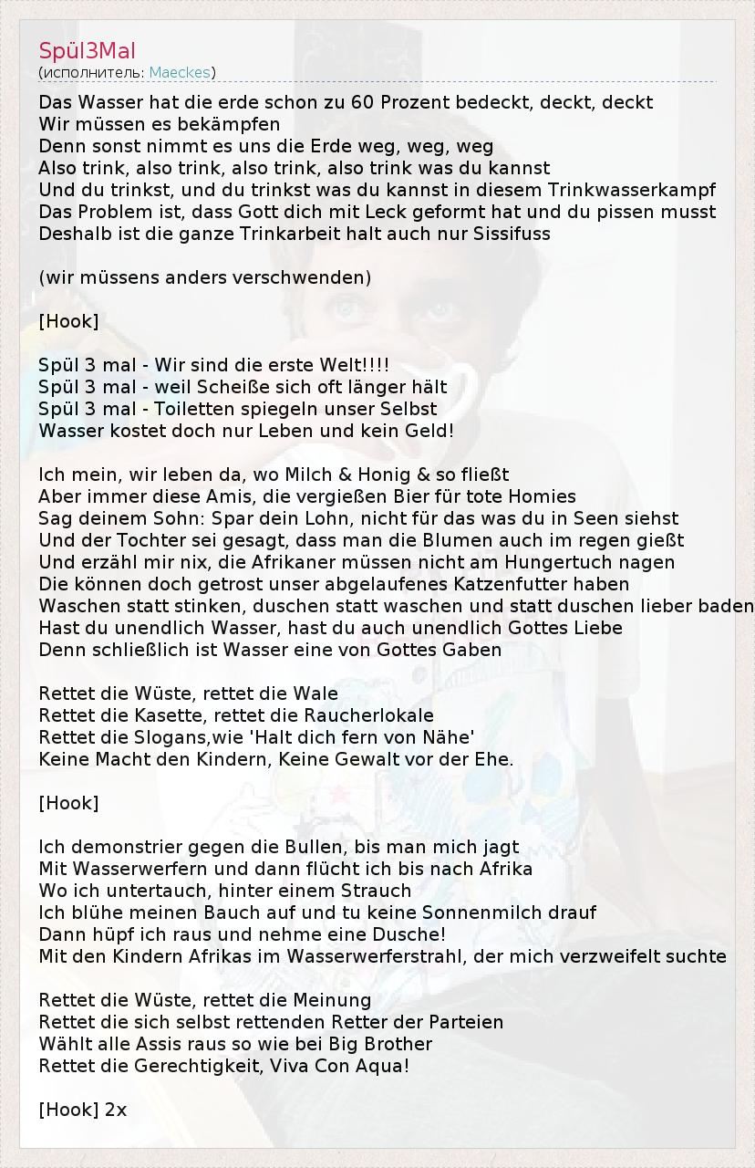 Das Wasser hat die erde schon zu 60 Prozent bedeckt, deckt, deckt Wir müssen es bekämpfen Denn sonst nimmt es uns die Erde weg, weg, weg Also trink, also trink, also trink, also trink was du kannst Und du trinkst, und du trinkst was du kannst in diesem Trinkwasserkampf Das Problem ist, dass Gott dich mit Leck geformt hat und du pissen musst Deshalb ist die ganze Trinkarbeit halt auch nur Sissifuss (wir müssens anders verschwenden) [Hook] Spül 3 mal - Wir sind die erste Welt!!!! Spül 3 mal - weil Scheiße sich oft länger hält Spül 3 mal - Toiletten spiegeln unser Selbst Wasser kostet doch nur Leben und kein Geld! Ich mein, wir leben da, wo Milch & Honig & so fließt Aber immer diese Amis, die vergießen Bier für tote Homies Sag deinem Sohn: Spar dein Lohn, nicht für das was du in Seen siehst Und der Tochter sei gesagt, dass man die Blumen auch im regen gießt Und erzähl mir nix, die Afrikaner müssen nicht am Hungertuch nagen Die können doch getrost unser abgelaufenes Katzenfutter haben Waschen statt stinken, duschen statt waschen und statt duschen lieber baden Hast du unendlich Wasser, hast du auch unendlich Gottes Liebe Denn schließlich ist Wasser eine von Gottes Gaben Rettet die Wüste, rettet die Wale Rettet die Kasette, rettet die Raucherlokale Rettet die Slogans,wie 'Halt dich fern von Nähe' Keine Macht den Kindern, Keine Gewalt vor der Ehe. [Hook] Ich demonstrier gegen die Bullen, bis man mich jagt Mit Wasserwerfern und dann flücht ich bis nach Afrika Wo ich untertauch, hinter einem Strauch Ich blühe meinen Bauch auf und tu keine Sonnenmilch drauf Dann hüpf ich raus und nehme eine Dusche! Mit den Kindern Afrikas im Wasserwerferstrahl, der mich verzweifelt suchte Rettet die Wüste, rettet die Meinung Rettet die sich selbst rettenden Retter der Parteien Wählt alle Assis raus so wie bei Big Brother Rettet die Gerechtigkeit, Viva Con Aqua! [Hook] 2x