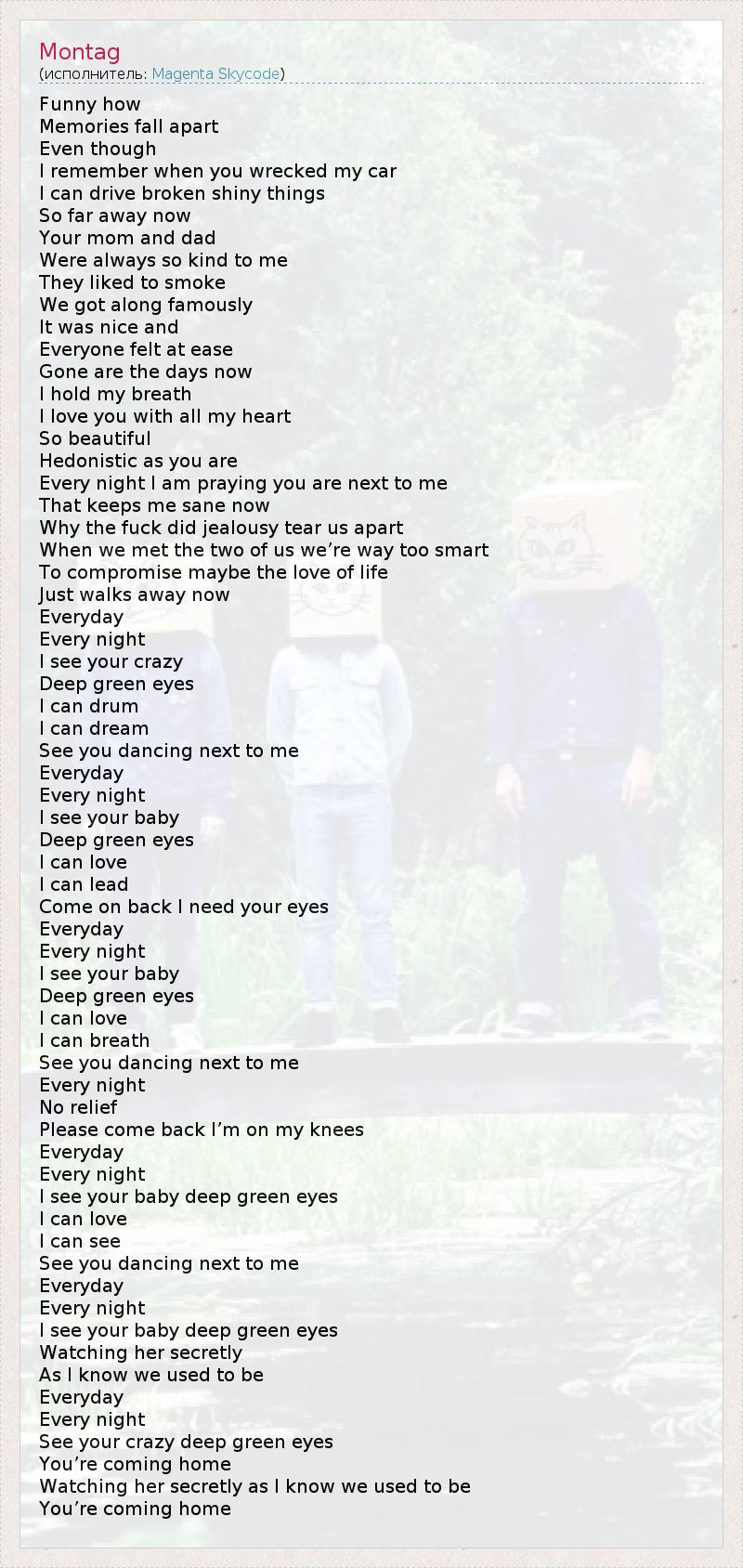 Funny how Memories fall apart Even though I remember when you wrecked my car I can drive broken shiny things So far away now Your mom and dad Were always so kind to me They liked to smoke We got along famously It was nice and Everyone felt at ease Gone are the days now I hold my breath I love you with all my heart So beautiful Hedonistic as you are Every night I am praying you are next to me That keeps me sane now Why the fuck did jealousy tear us apart When we met the two of us we’re way too smart To compromise maybe the love of life Just walks away now Everyday Every night I see your crazy Deep green eyes I can drum I can dream See you dancing next to me Everyday Every night I see your baby Deep green eyes I can love I can lead Come on back I need your eyes Everyday Every night I see your baby Deep green eyes I can love I can breath See you dancing next to me Every night No relief Please come back I’m on my knees Everyday Every night I see your baby deep green eyes I can love I can see See you dancing next to me Everyday Every night I see your baby deep green eyes Watching her secretly As I know we used to be Everyday Every night See your crazy deep green eyes You’re coming home Watching her secretly as I know we used to be You’re coming home