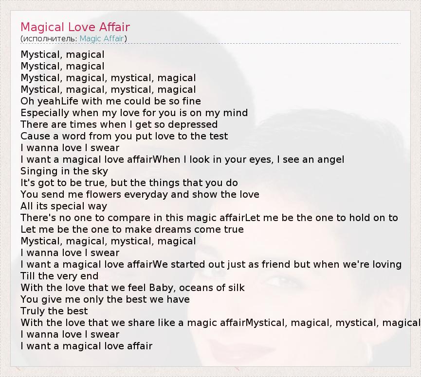 Mystical, magical Mystical, magical Mystical, magical, mystical, magical Mystical, magical, mystical, magical Oh yeahLife with me could be so fine Especially when my love for you is on my mind There are times when I get so depressed Cause a word from you put love to the test I wanna love I swear I want a magical love affairWhen I look in your eyes, I see an angel Singing in the sky It's got to be true, but the things that you do You send me flowers everyday and show the love All its special way There's no one to compare in this magic affairLet me be the one to hold on to Let me be the one to make dreams come true Mystical, magical, mystical, magical I wanna love I swear I want a magical love affairWe started out just as friend but when we're loving Till the very end With the love that we feel Baby, oceans of silk You give me only the best we have Truly the best With the love that we share like a magic affairMystical, magical, mystical, magical I wanna love I swear I want a magical love affair